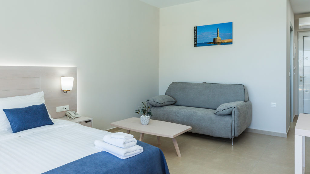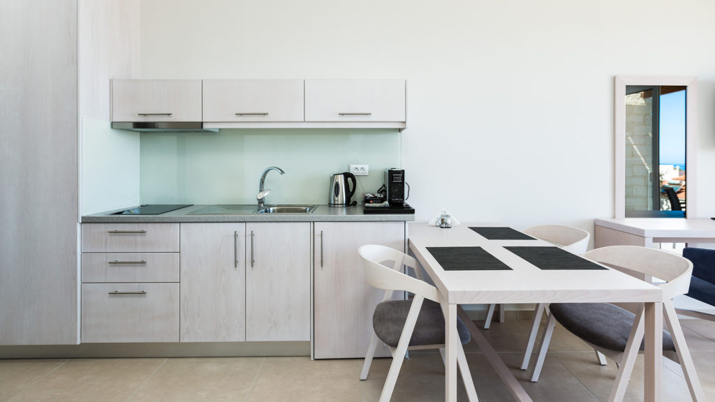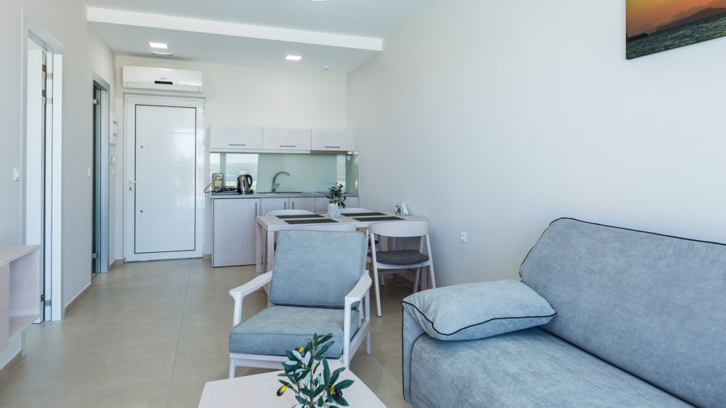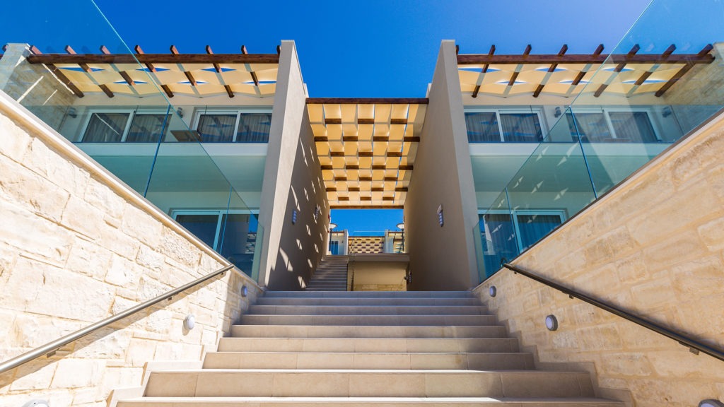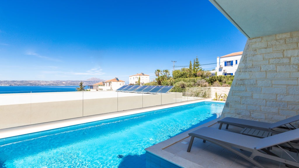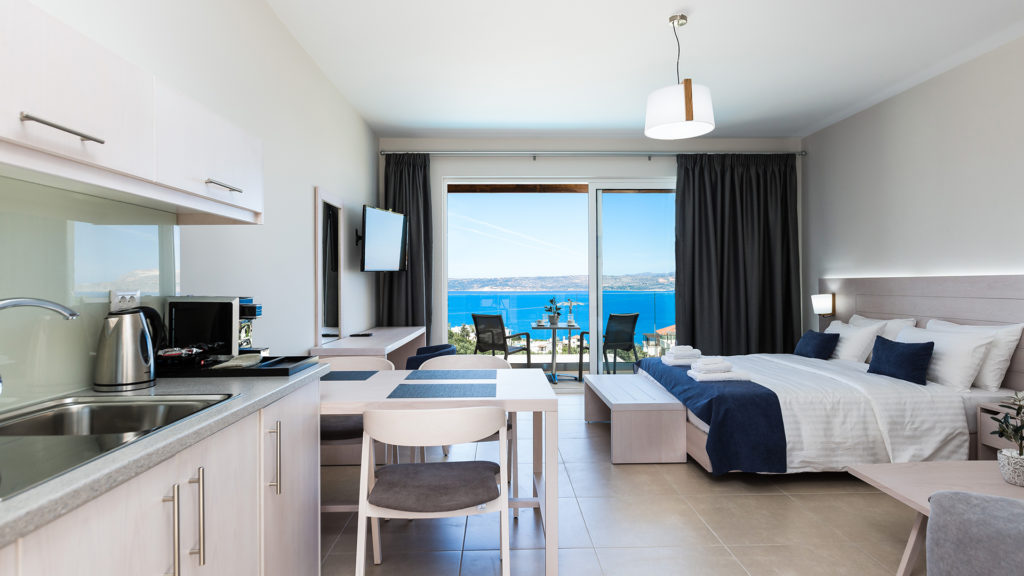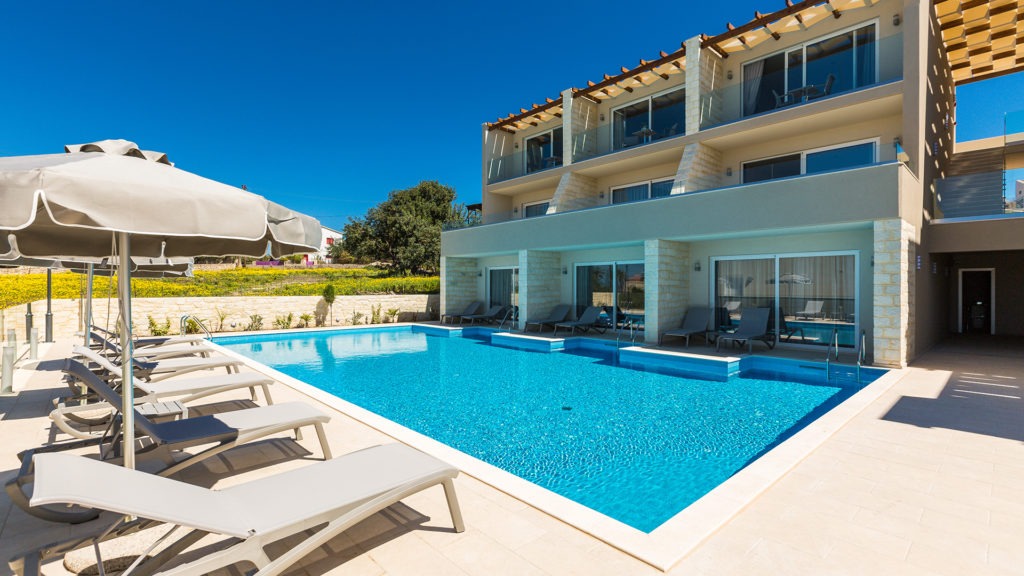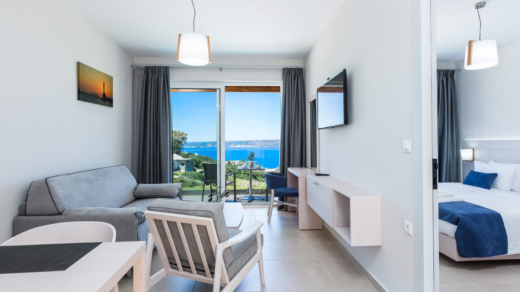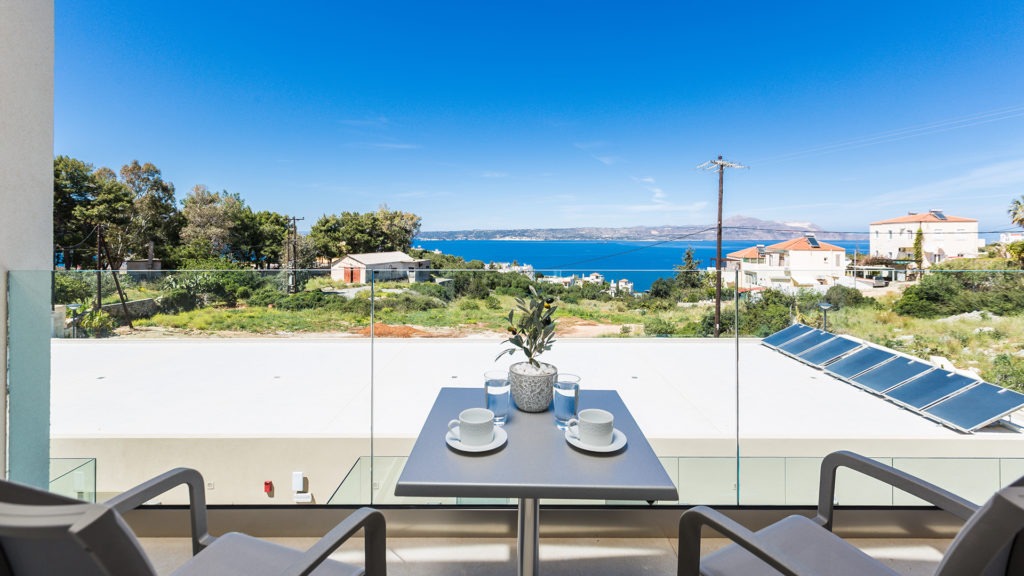 Built on a natural slope, the hotel offers sweeping views of the Cretan Sea. Each unit includes flat-screen TVs, premium kitchen appliances, and stylish furnishings. Ground-floor units have direct pool access, while upper floors feature large balconies.