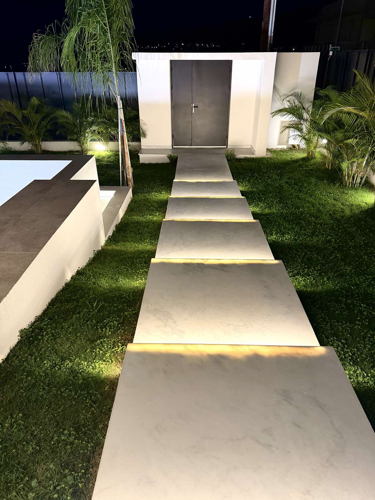 The middle level of 120m² offers an open-plan living area seamlessly integrating with a modern kitchen and also includes a guest WC and a pantry. The ground floor opens onto a magnificent 100m² veranda complete with BBQ facilities, complemented by a private swimming pool and landscaped garden. A rear courtyard provides a generous 75m² garage.
