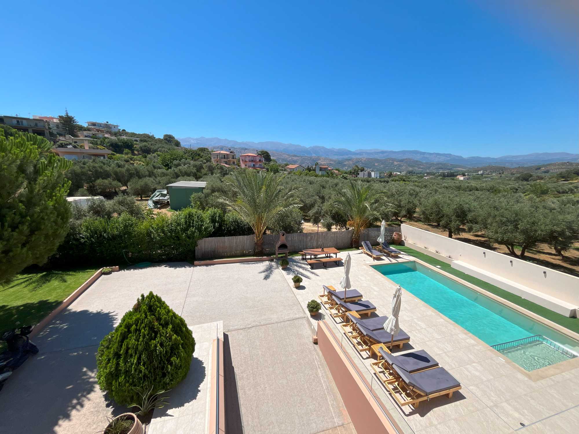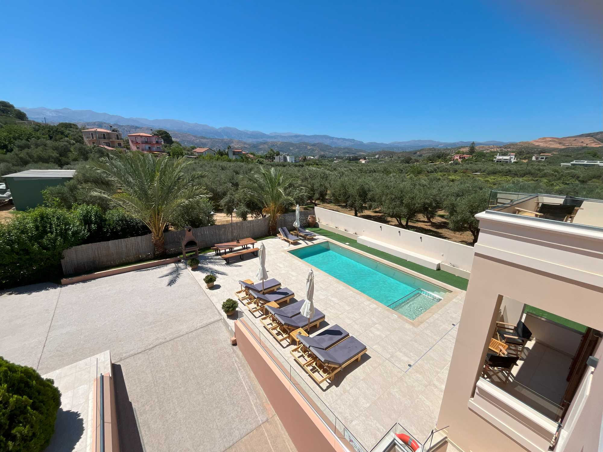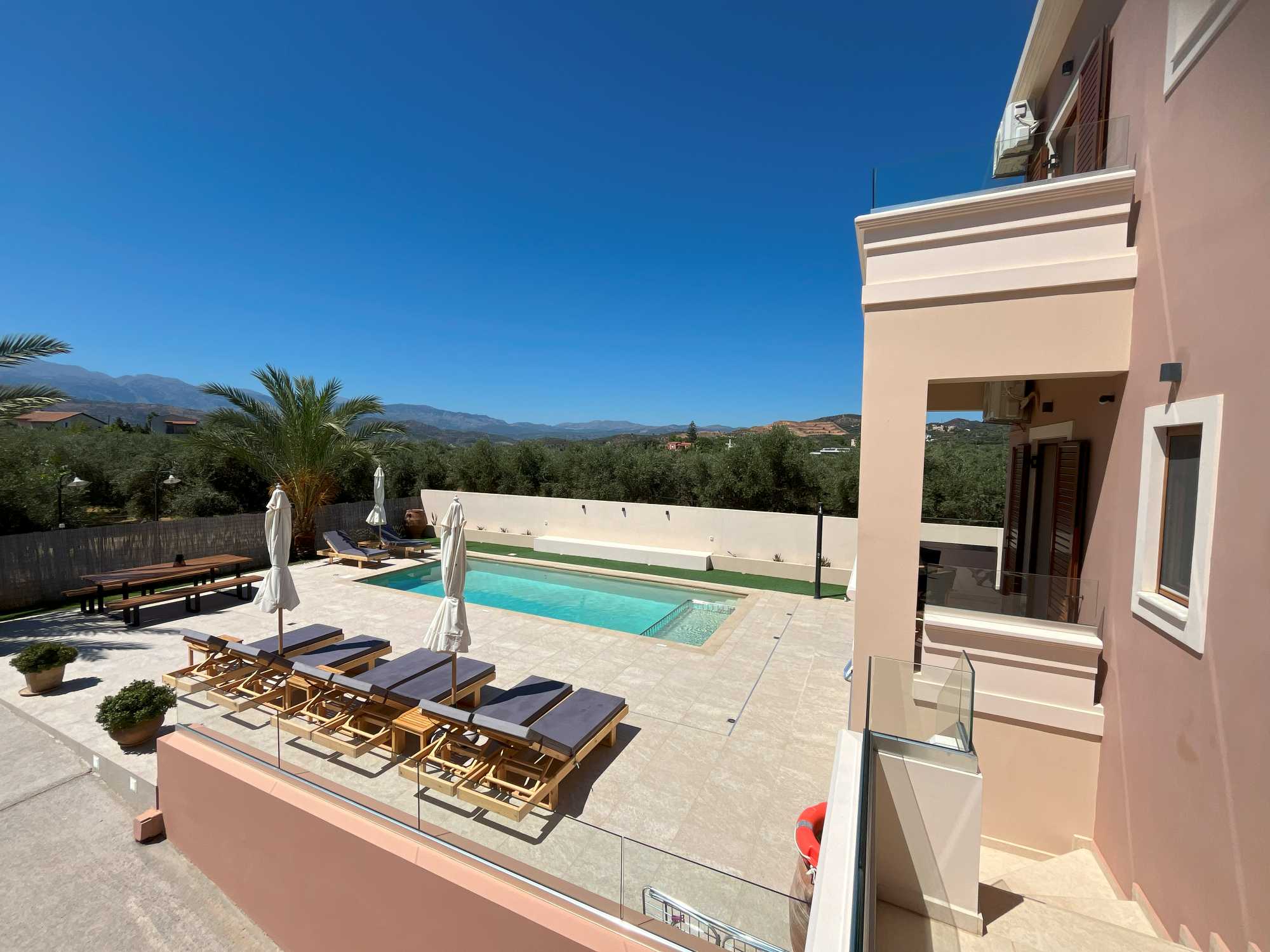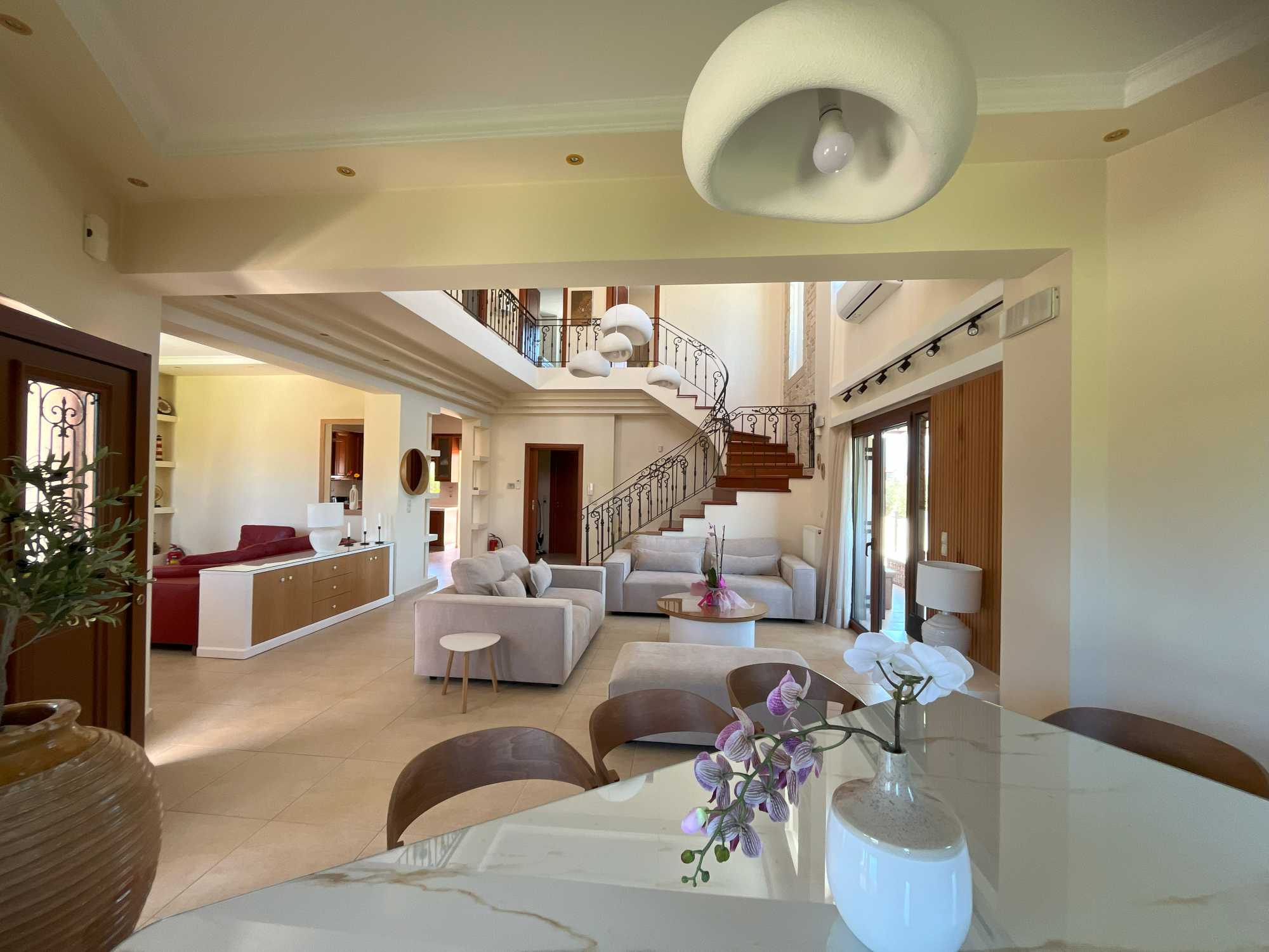 This exceptional high quality villa for sale in Chania Crete is positioned on an expansive 4,300m² plot, overlooking the mountains and offering privacy and tranquility in one of Crete’s most sought-after locations. The property features a spacious 200m² main house, including 4 bedrooms, master en-suite and 3 bathrooms with traditional Mediterranean architecture and a versatile 100m² basement that hosts the garage and provides excellent storage space and potential for conversion into a gym, playroom, or TV room.