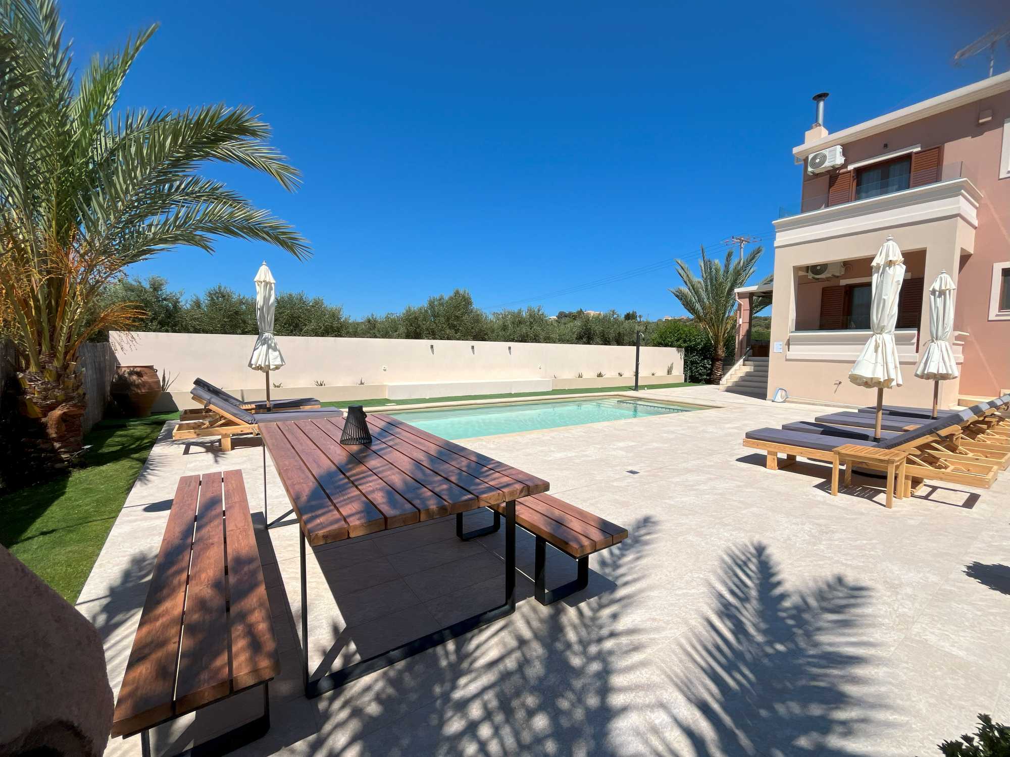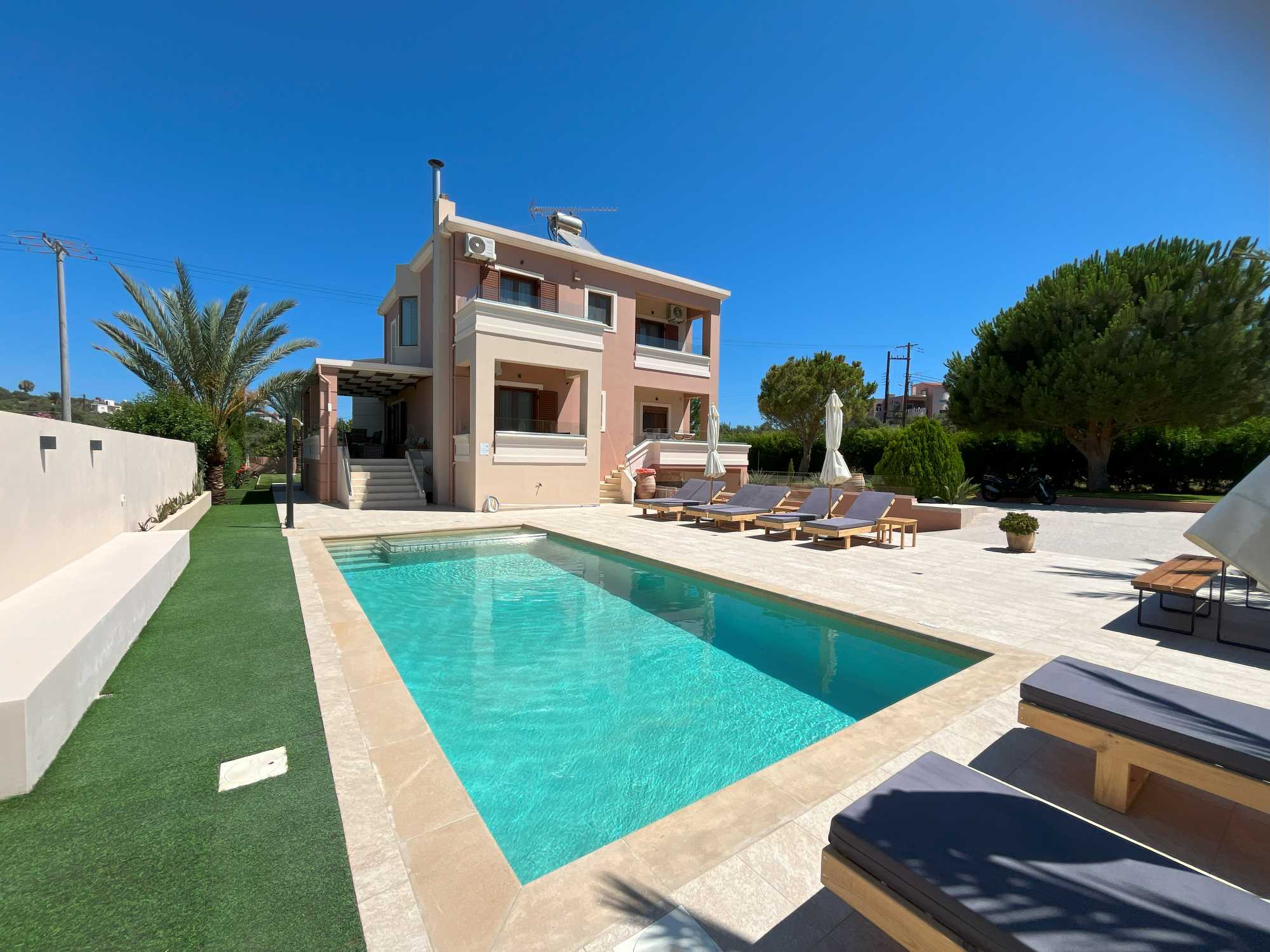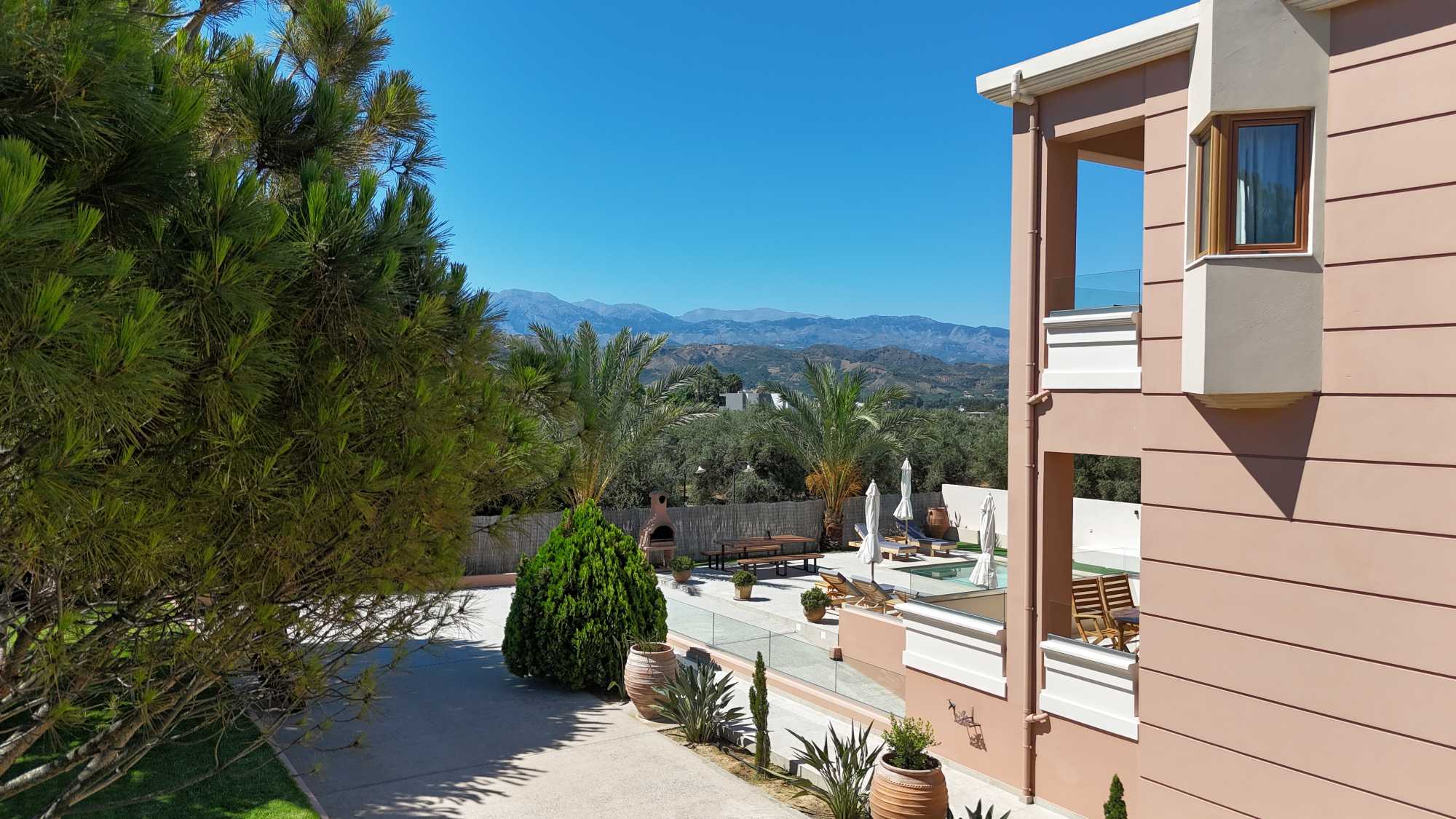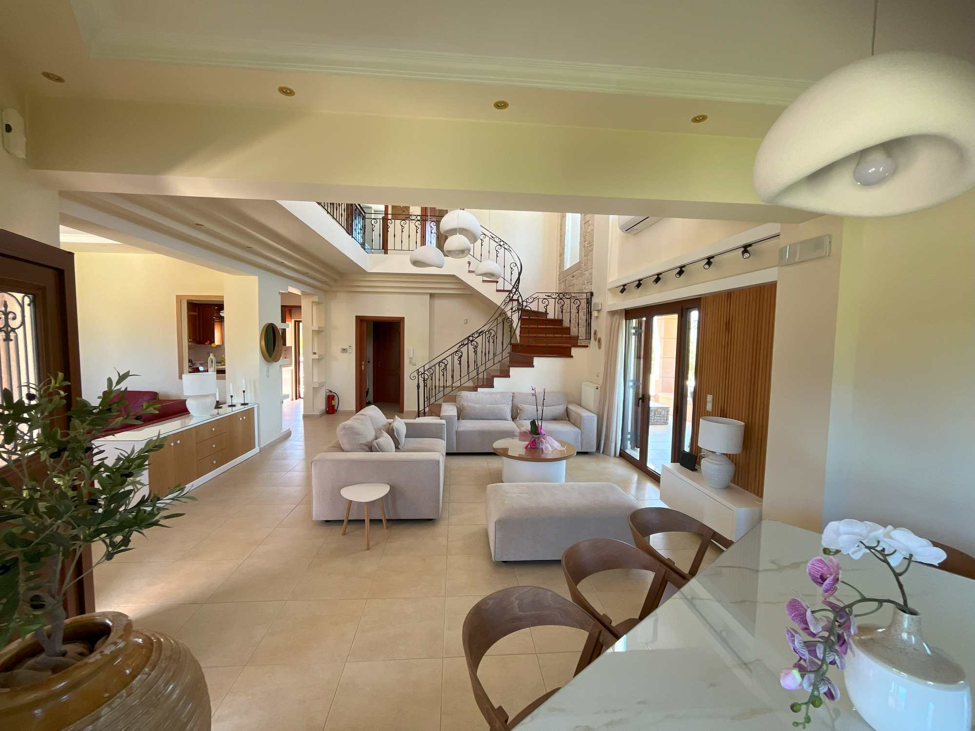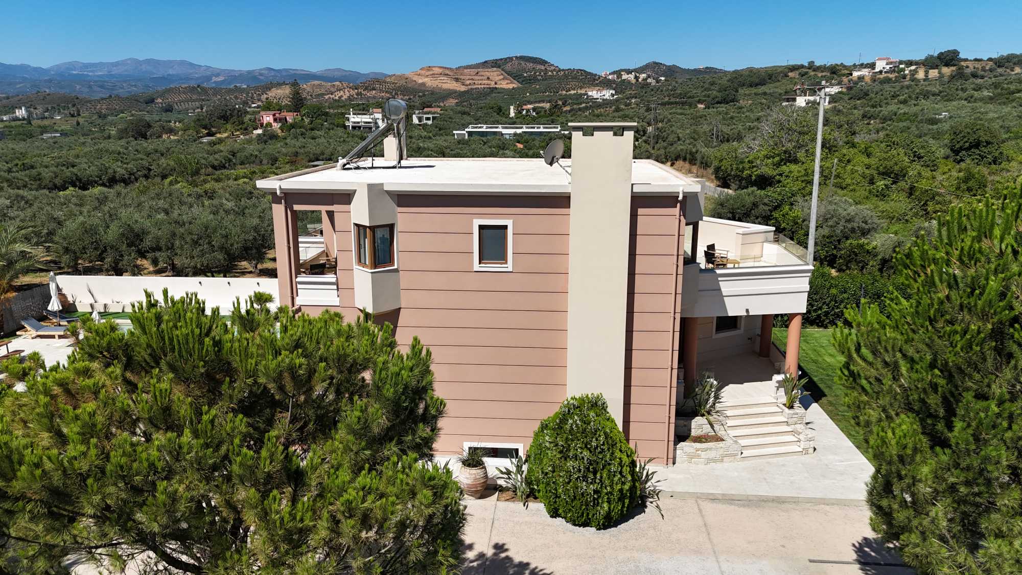 This exceptional high quality villa for sale in Chania Crete is positioned on an expansive 4,300m² plot, overlooking the mountains and offering privacy and tranquility in one of Crete’s most sought-after locations. The property features a spacious 200m² main house, including 4 bedrooms, master en-suite and 3 bathrooms with traditional Mediterranean architecture and a versatile 100m² basement that hosts the garage and provides excellent storage space and potential for conversion into a gym, playroom, or TV room.