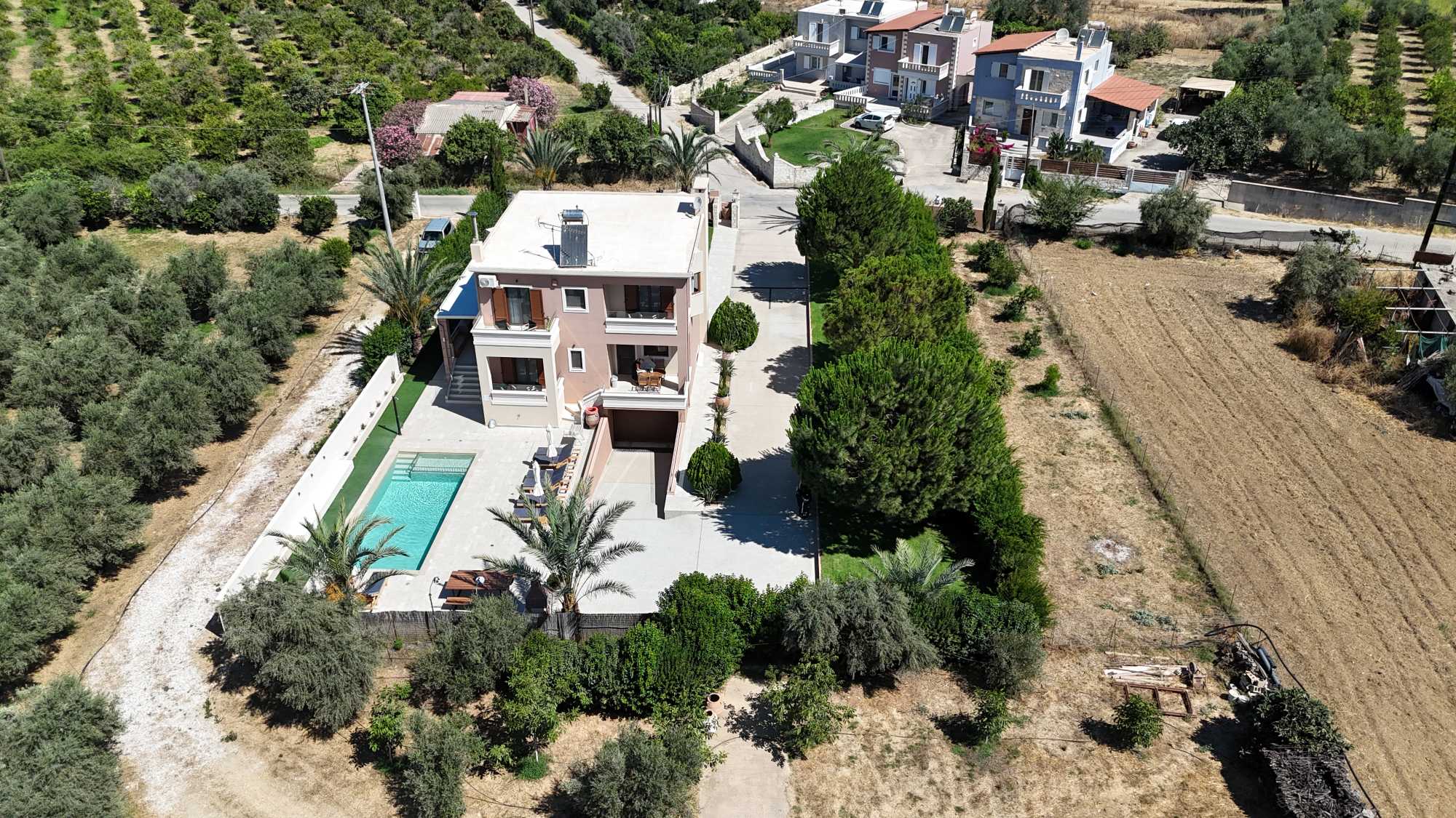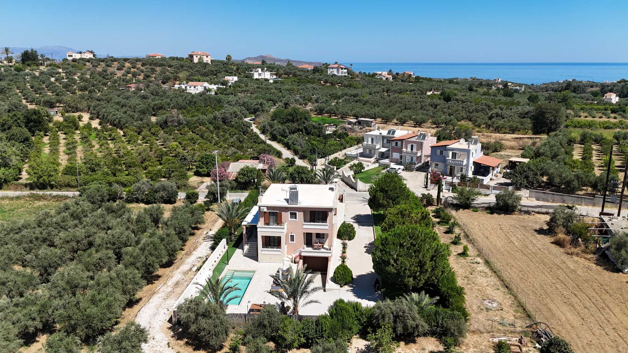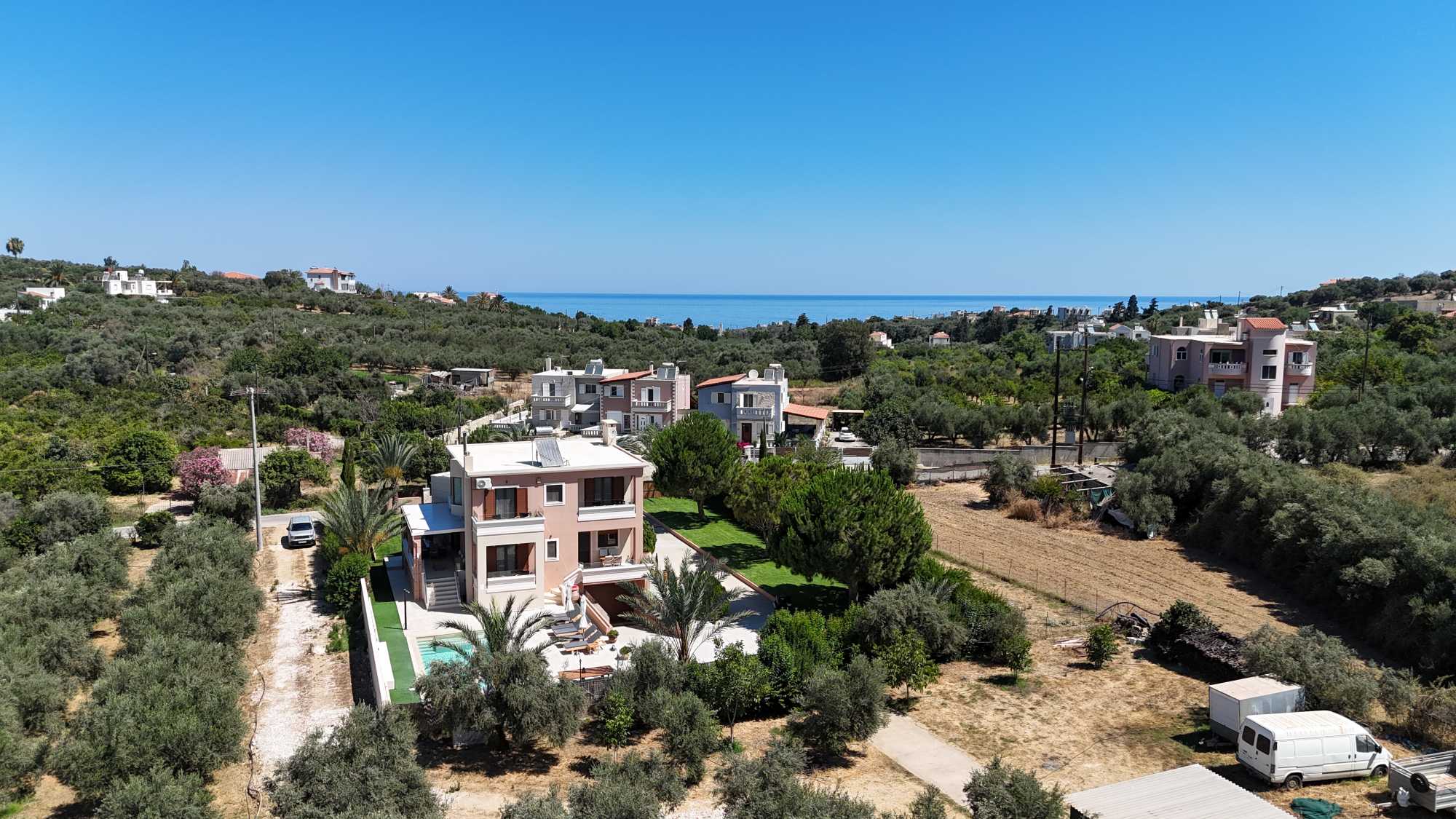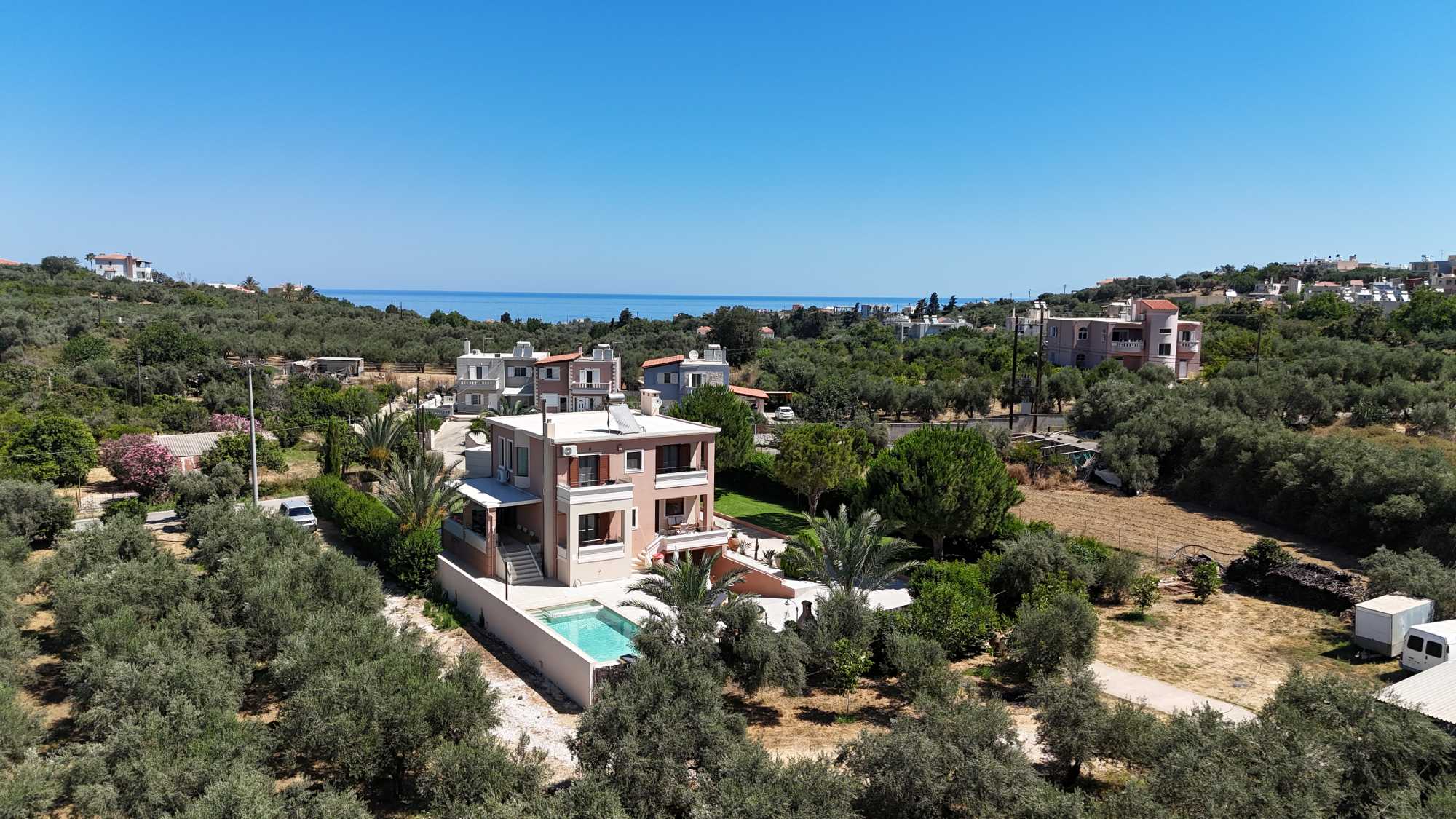 The location provides an ideal balance of peaceful residential living with convenient access to Crete’s attractions. Beautiful beaches with crystal-clear waters are just 2 kilometers away, perfect for daily swimming and water activities. The village center is within comfortable walking distance, where you’ll find authentic tavernas and a mini market for daily essentials. Chania’s historic center, is only 10 minutes away by car.