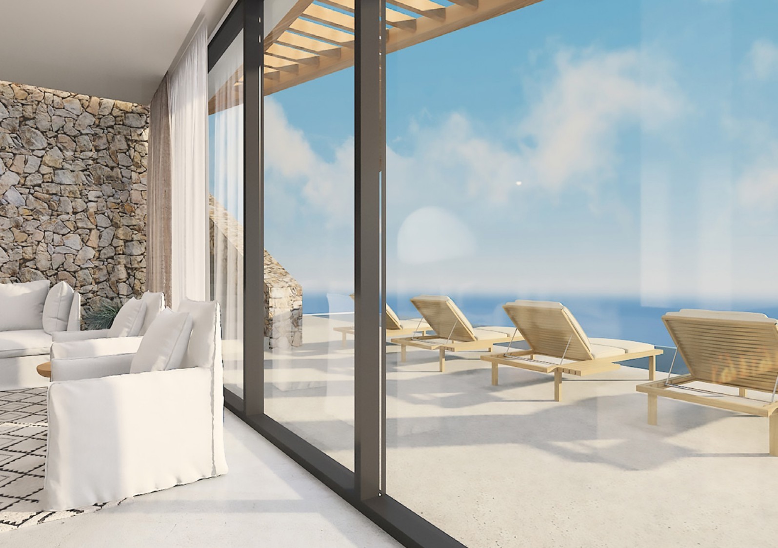 The property will be developed on 2 levels, on a clifftop, plot of land of 3698m2 overlooking the absolute blue of the Cretan Sea. With the total size of 225m2, this residence includes 3 en-suite bedrooms plus 1 secondary living or guest room and a WC.