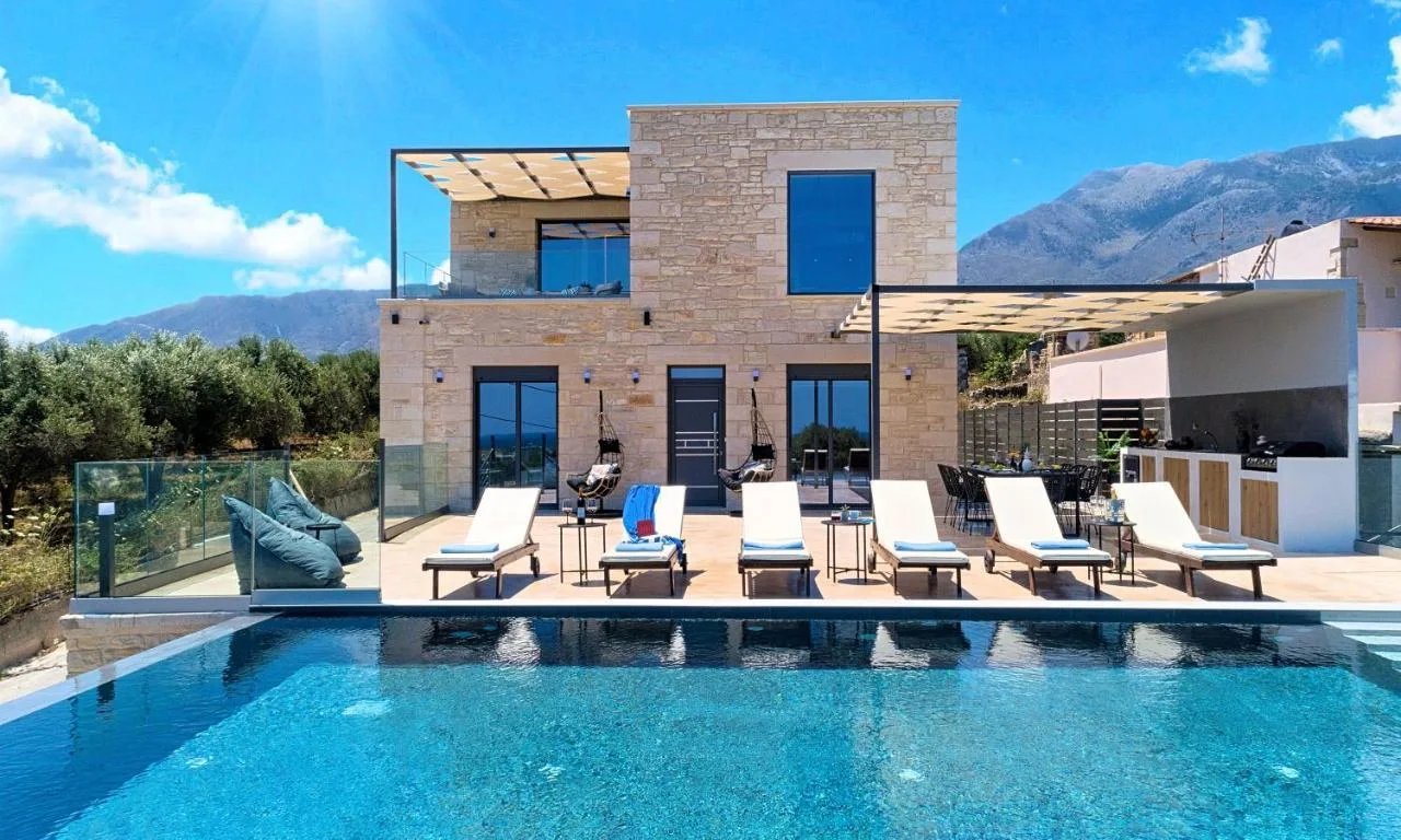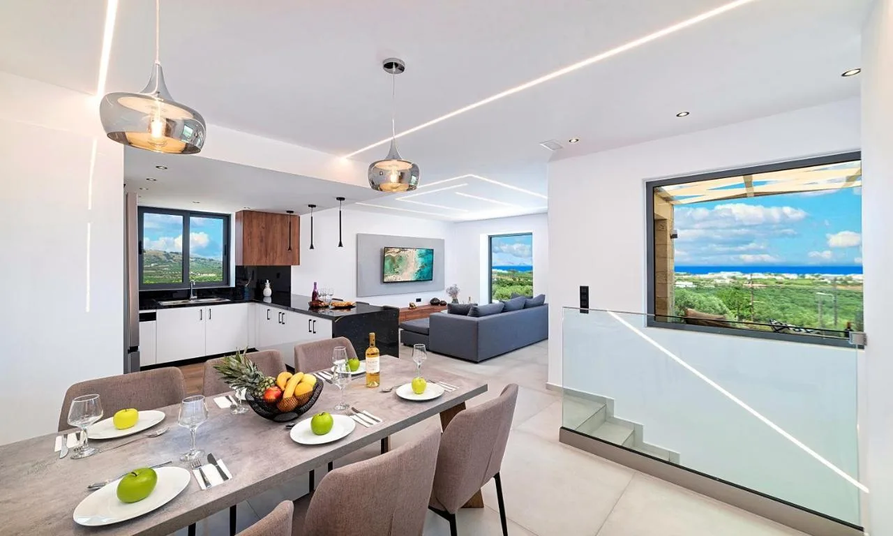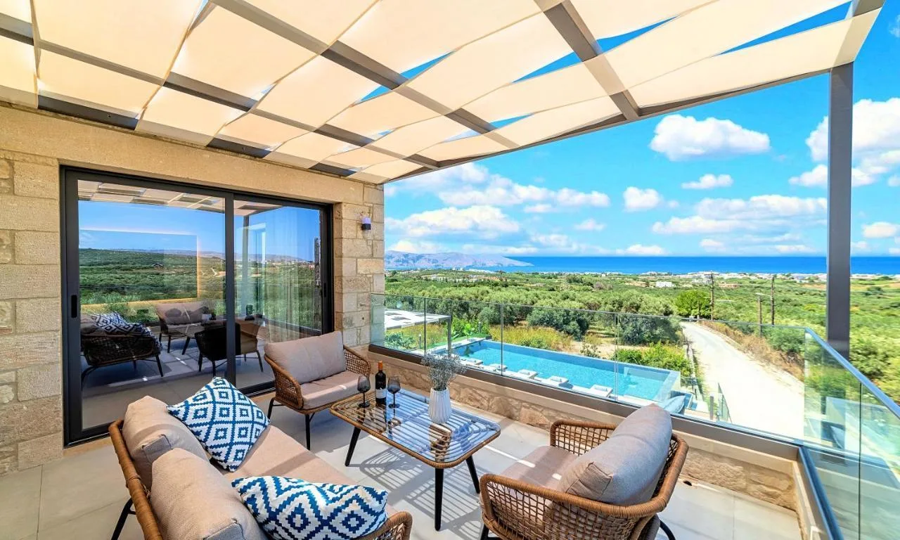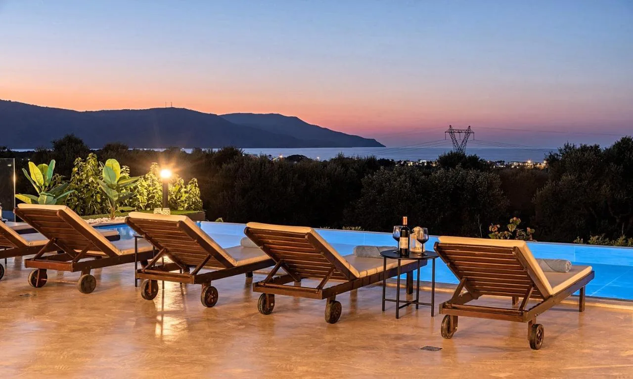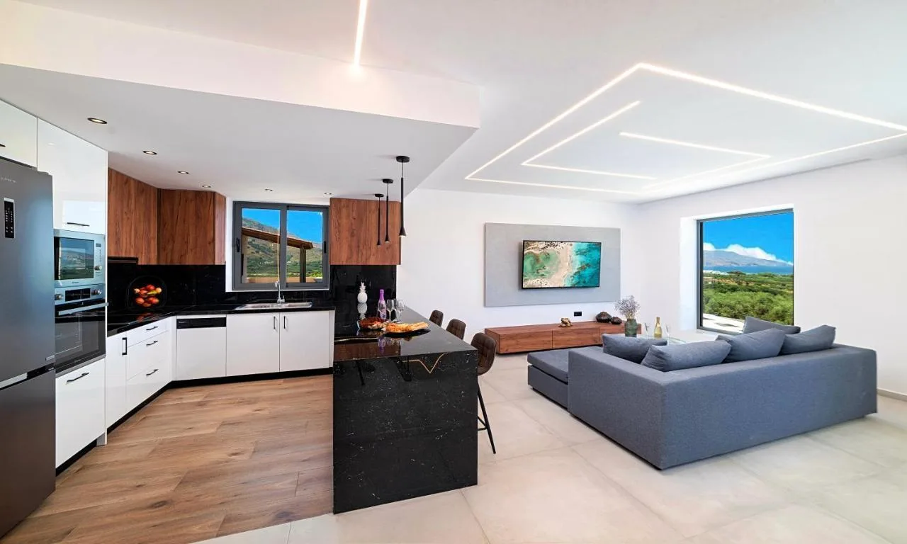 The property boasts a private swimming pool surrounded by lush gardens and breathtaking views. This villa with sea views for sale in Chania Crete features spacious terraces and panoramic windows providing wide open sea views, perfect for enjoying spectacular sunsets. The completed villa showcases modern décor and premium amenities designed for ultimate comfort and relaxation.