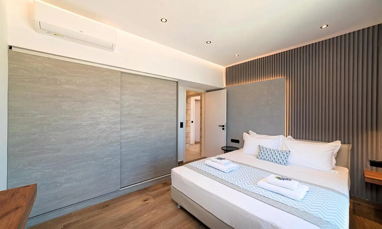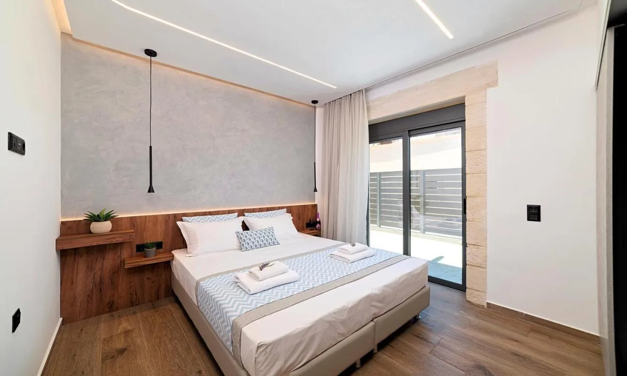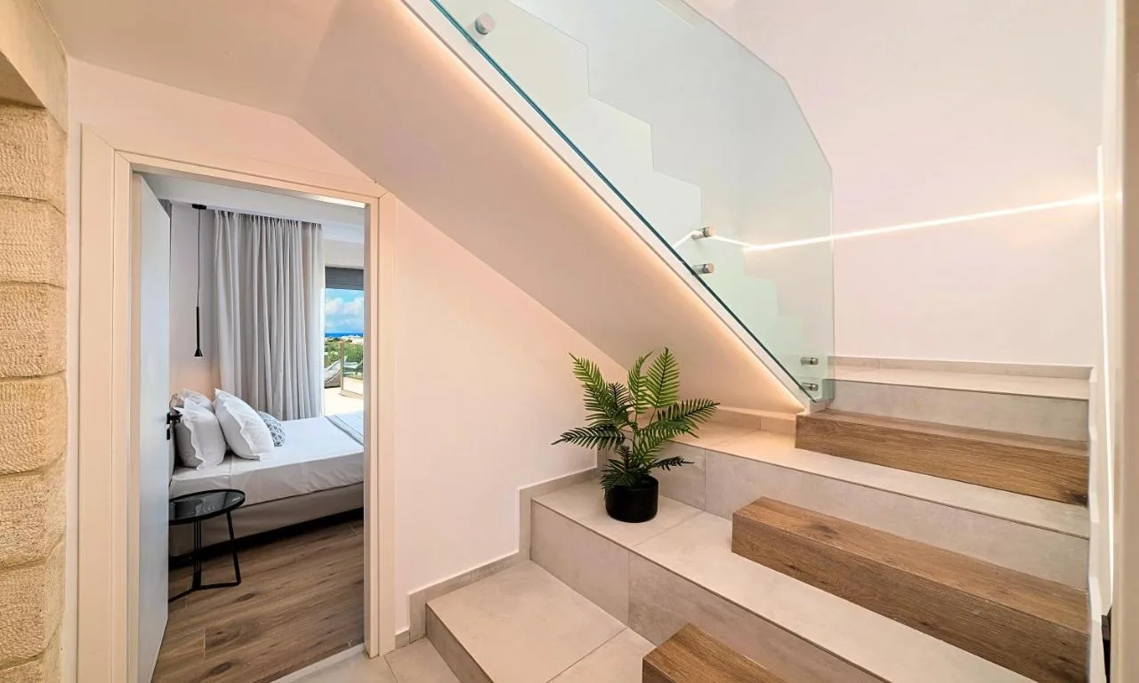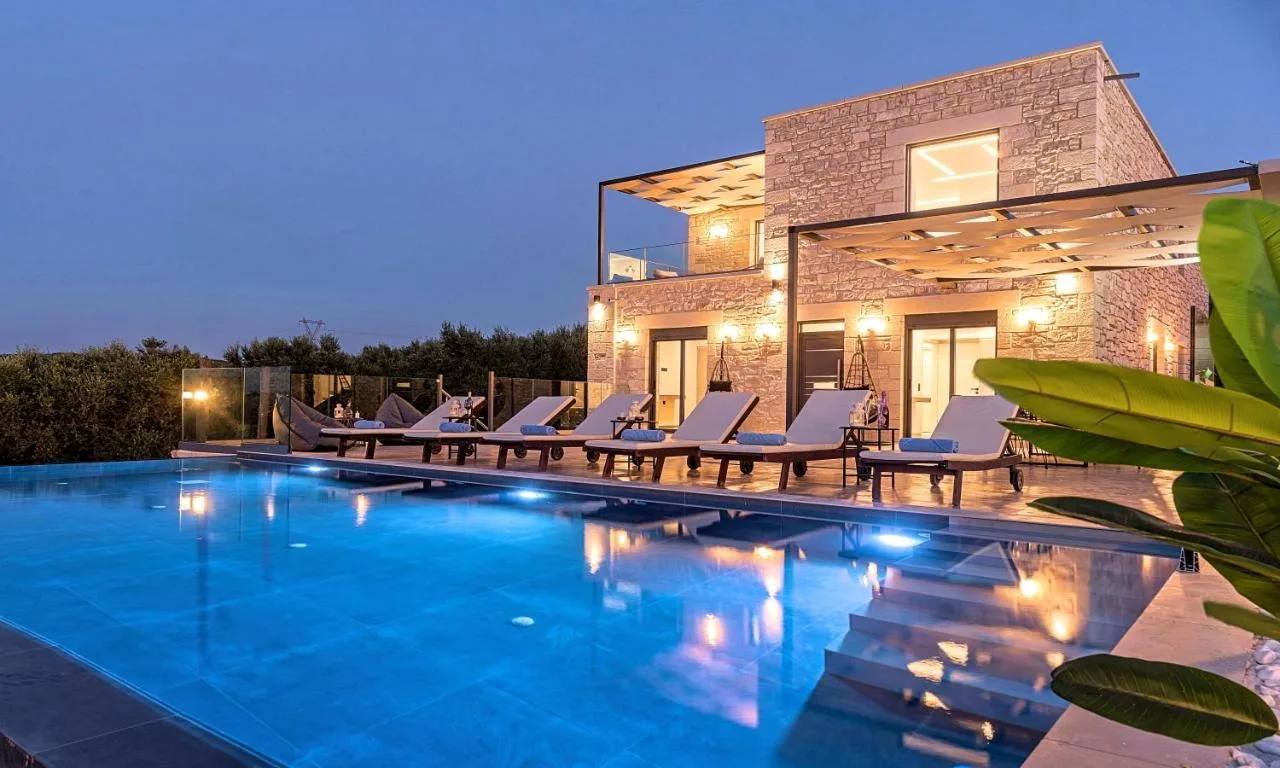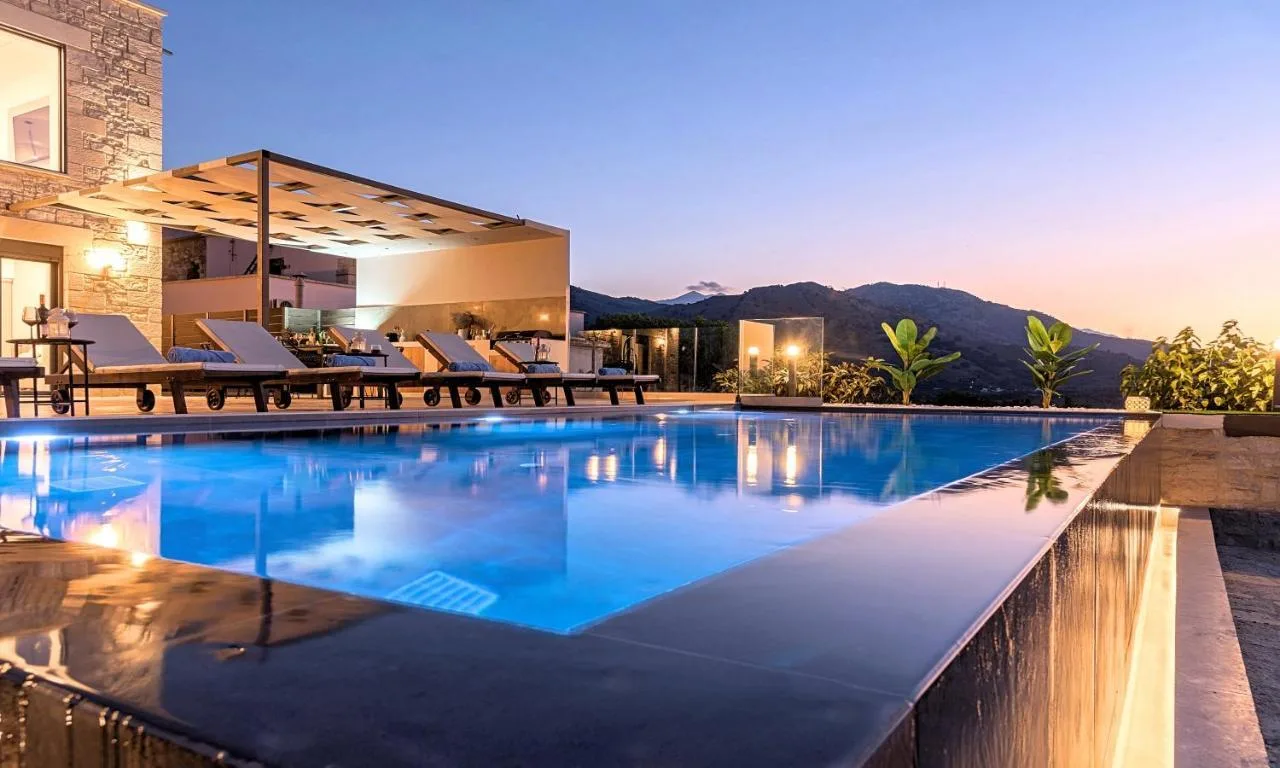 The property boasts a private swimming pool surrounded by lush gardens and breathtaking views. This villa with sea views for sale in Chania Crete features spacious terraces and panoramic windows providing wide open sea views, perfect for enjoying spectacular sunsets. The completed villa showcases modern décor and premium amenities designed for ultimate comfort and relaxation.