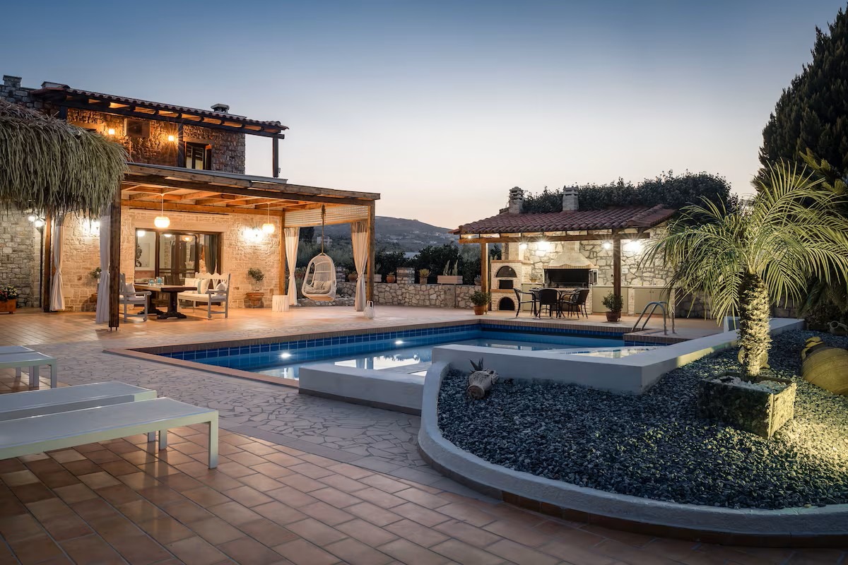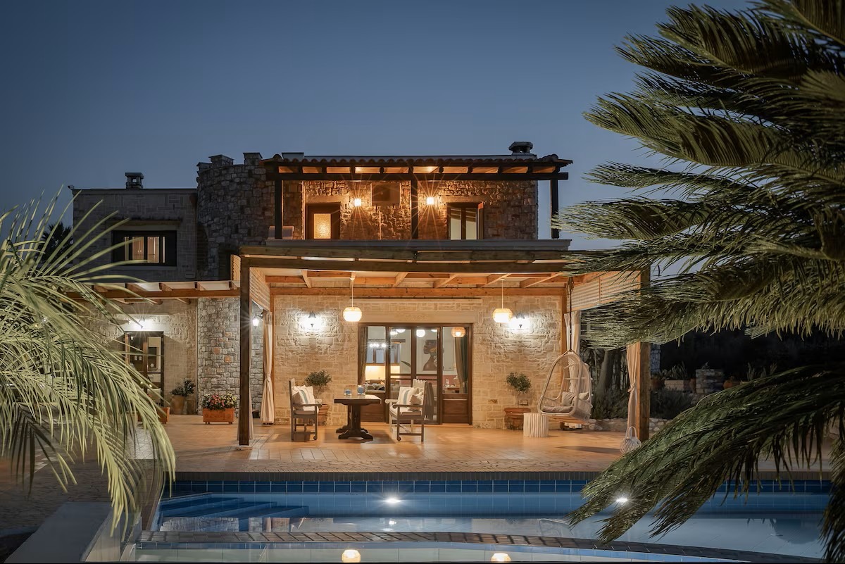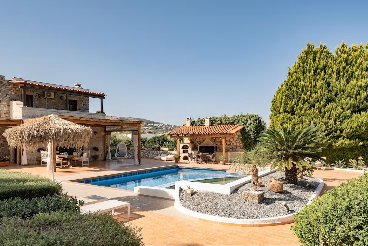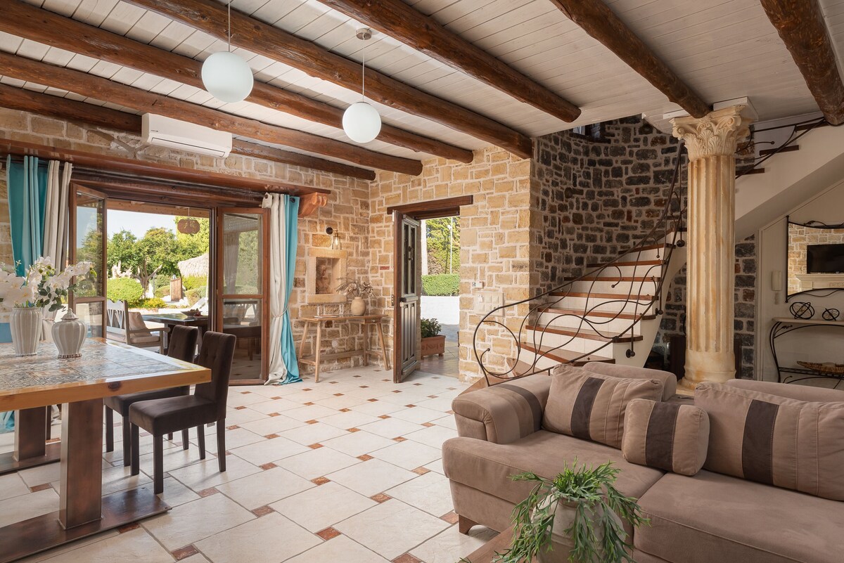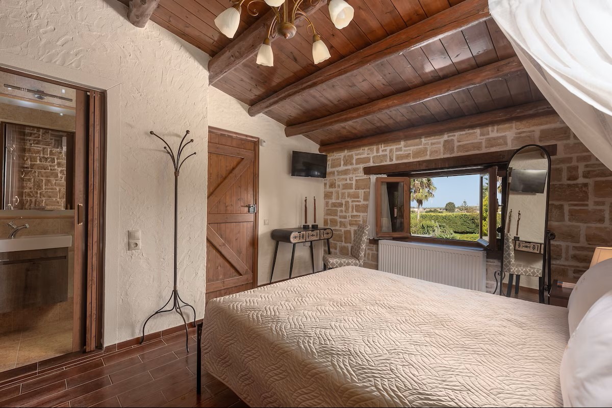 This beautifully crafted stone mansion features four elegantly designed bedrooms, open-plan living spaces with natural light, and authentic wooden ceilings that showcase traditional Cretan architecture.