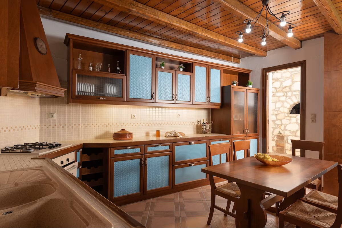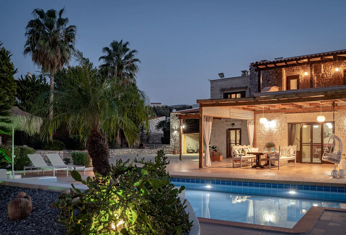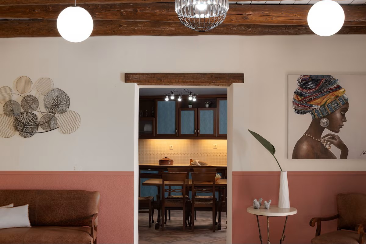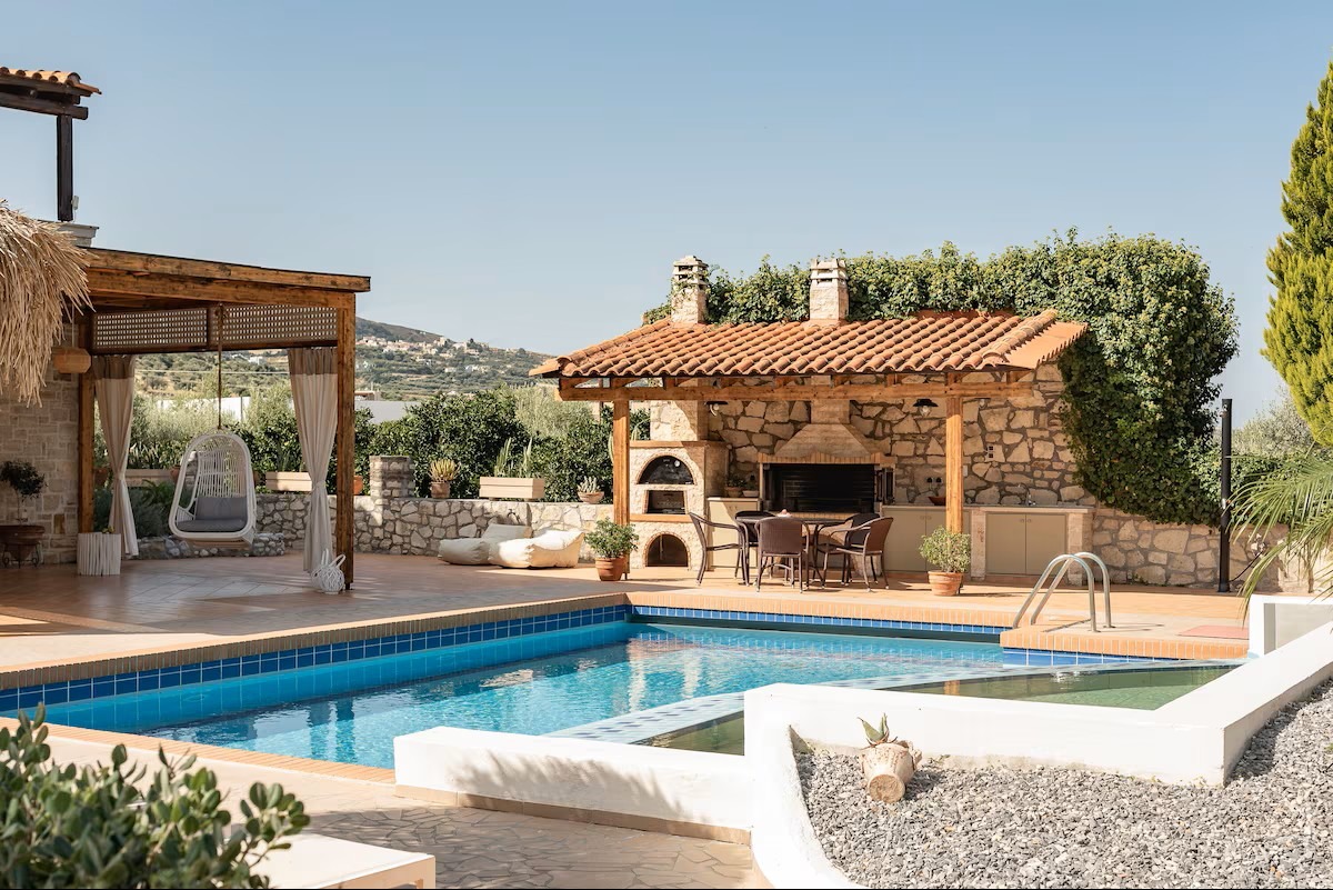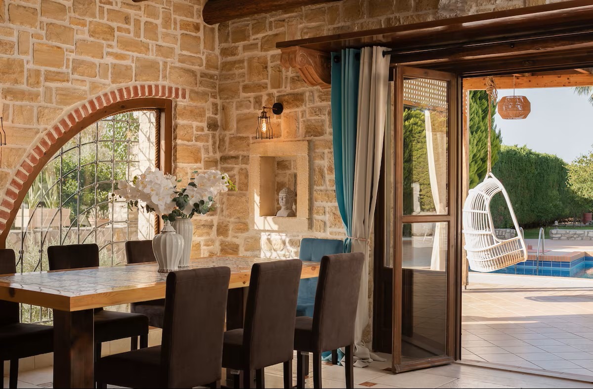 This beautifully crafted stone mansion features four elegantly designed bedrooms, open-plan living spaces with natural light, and authentic wooden ceilings that showcase traditional Cretan architecture.