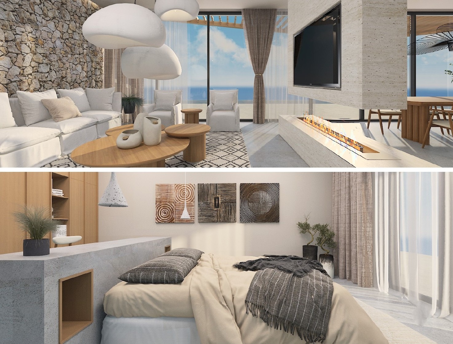This is one of a kind off plan villa for sale in Apokoronas Chania, on the island of Crete. The uniqueness of this property is that it can be accessed by car from Kefalas village or by boat from Georgioupolis port. This offers the possibility to have your own private berth, with floating decks on the seawater of the natural little port, at the edge of the plot. This cave villa will be developed on 3 levels, on a clifftop, seafront plot of land of 4757m2 overlooking the absolute blue of the Cretan Sea. With the total size of 430m2, this residence includes the main house with 4 en-suite bedrooms and a guest WC, while the independent guest apartment with its 2 en-suite bedrooms and living & kitchen area, can accommodate your guests with total privacy and comfort.