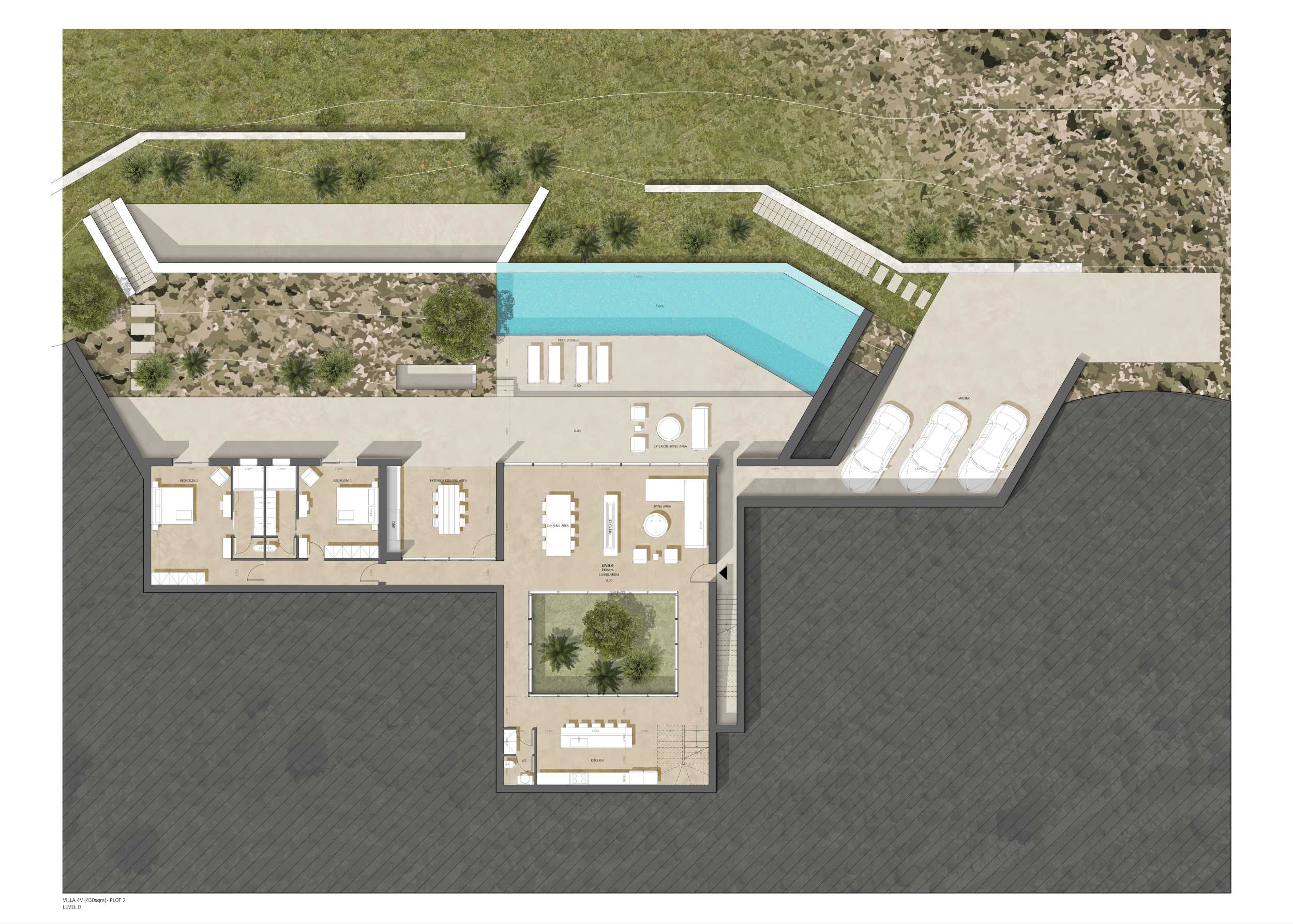 Additionally, this contemporary villa features spacious common areas with an indoor garden and a central fireplace, outdoor covered living and dining areas with BBQ facilities, a large 60m2 swimming pool and sunbathing area,a landscaped & planted fenced garden with paths all around and a parking area for 3 cars.