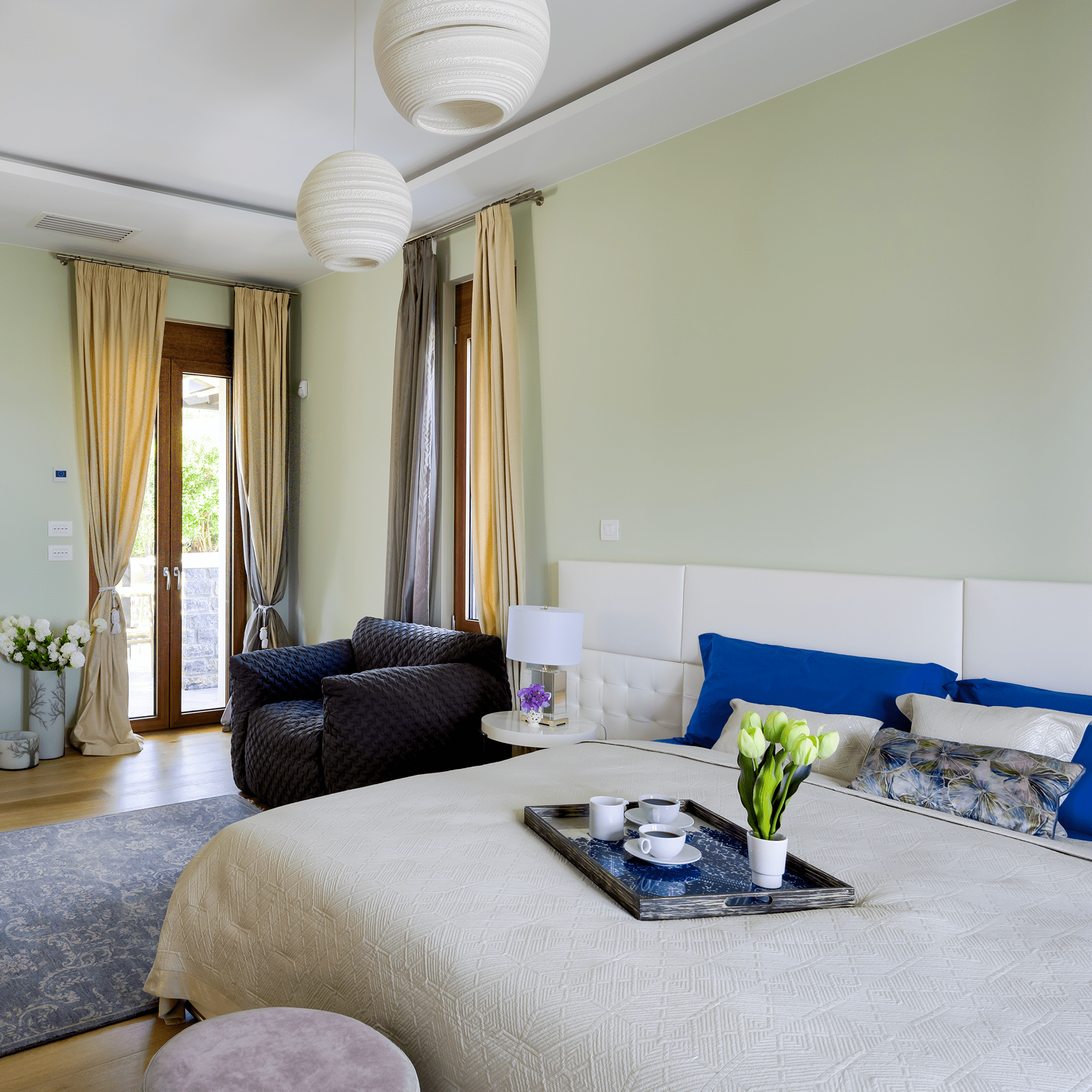 Inside, the villa has 5 spacious bedrooms and 6 bathrooms, each designed with unique style and high-end materials. The bedrooms offer stunning views or access to private balconies. The living areas are both modern and elegant, featuring sleek finishes, deep blue accents, and stylish designer touches that reflect the charm of the island.