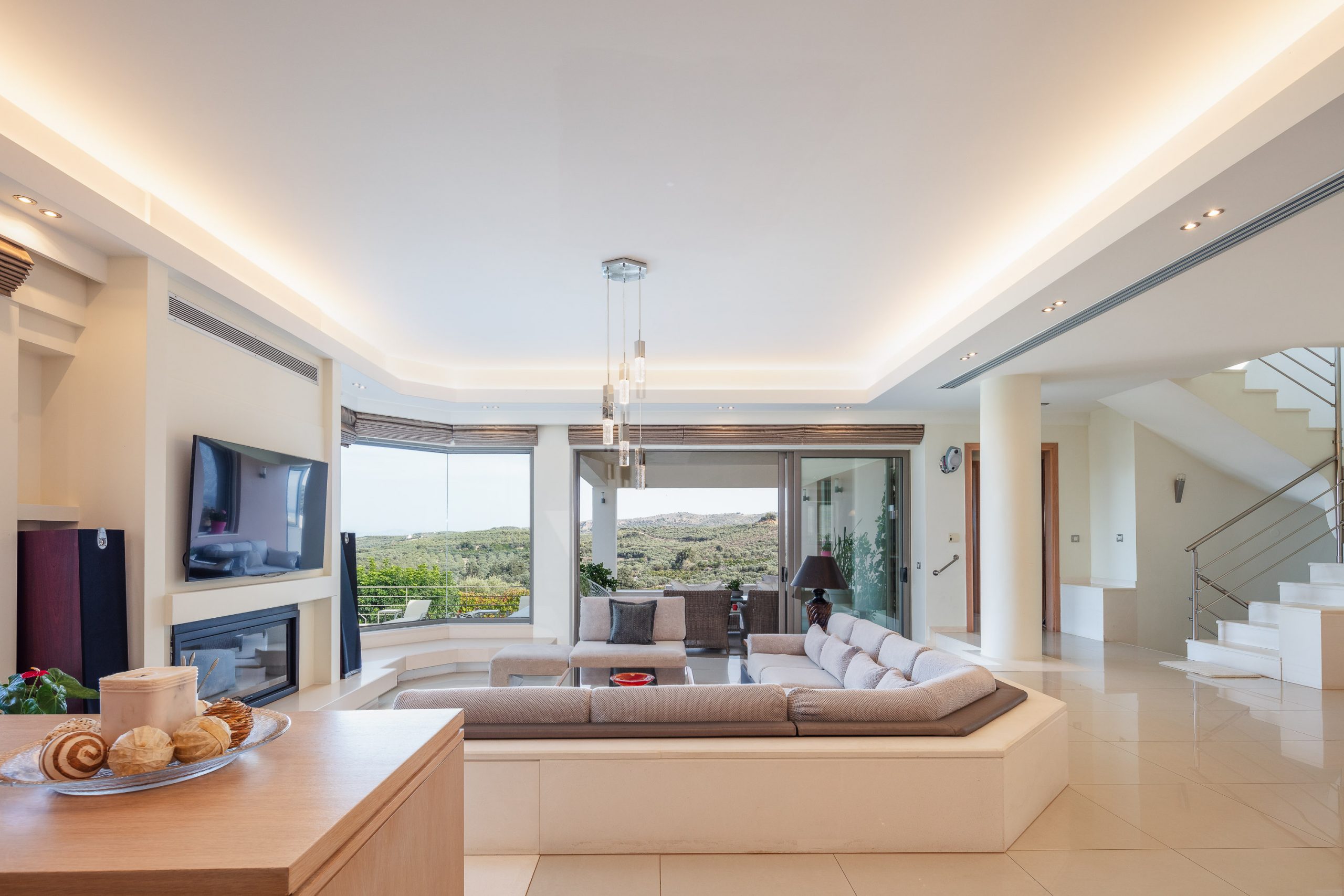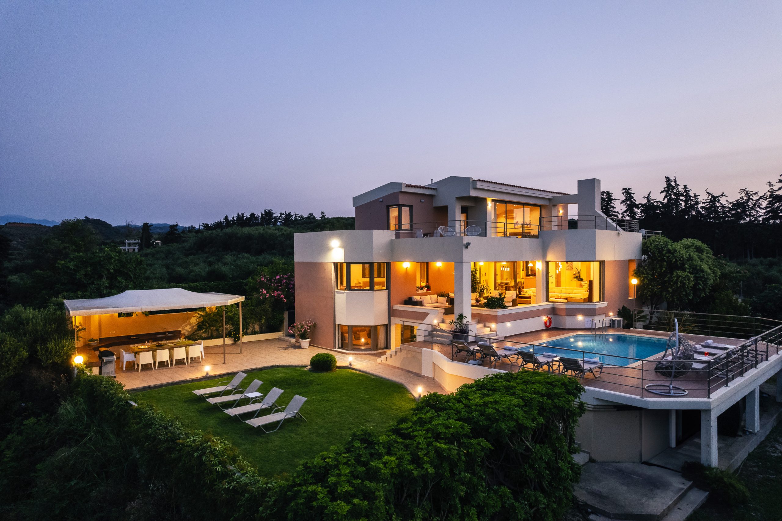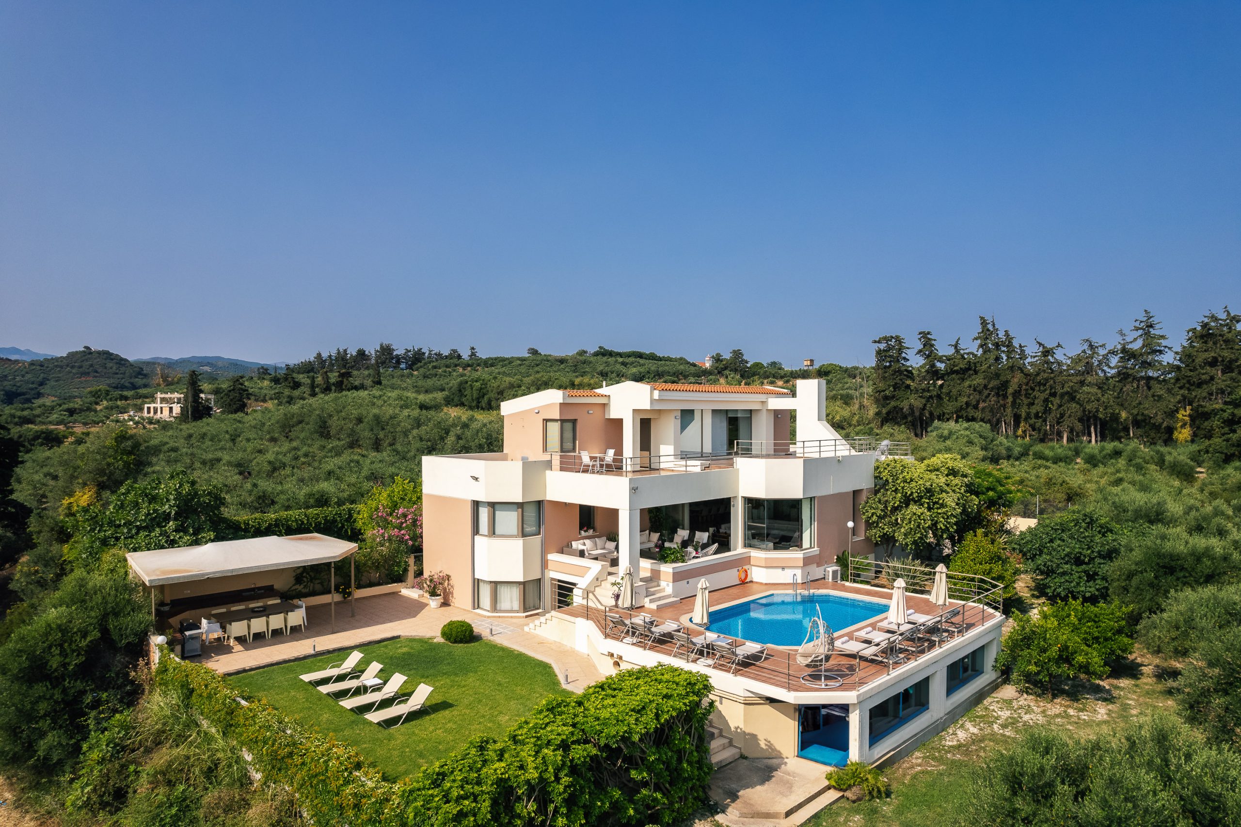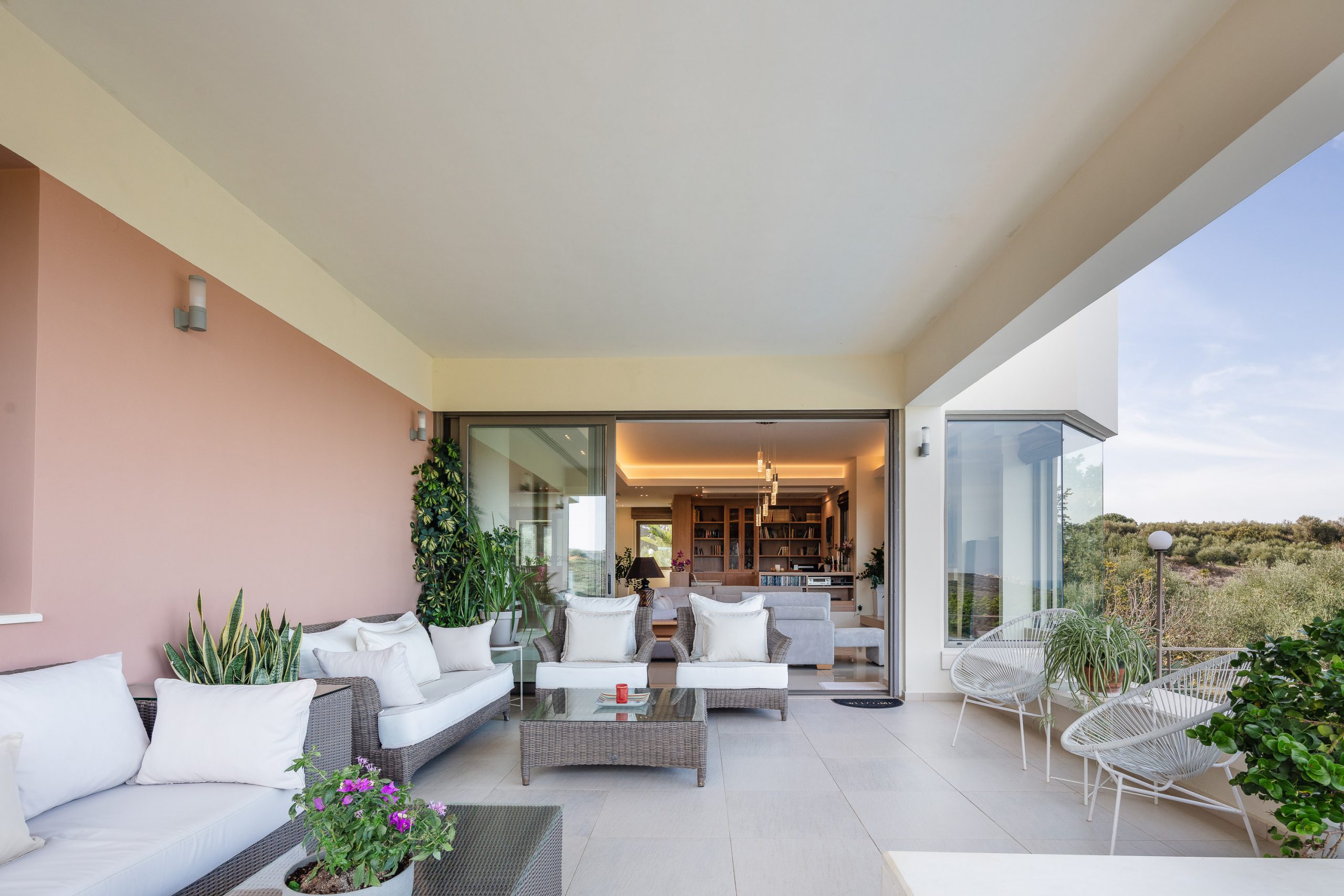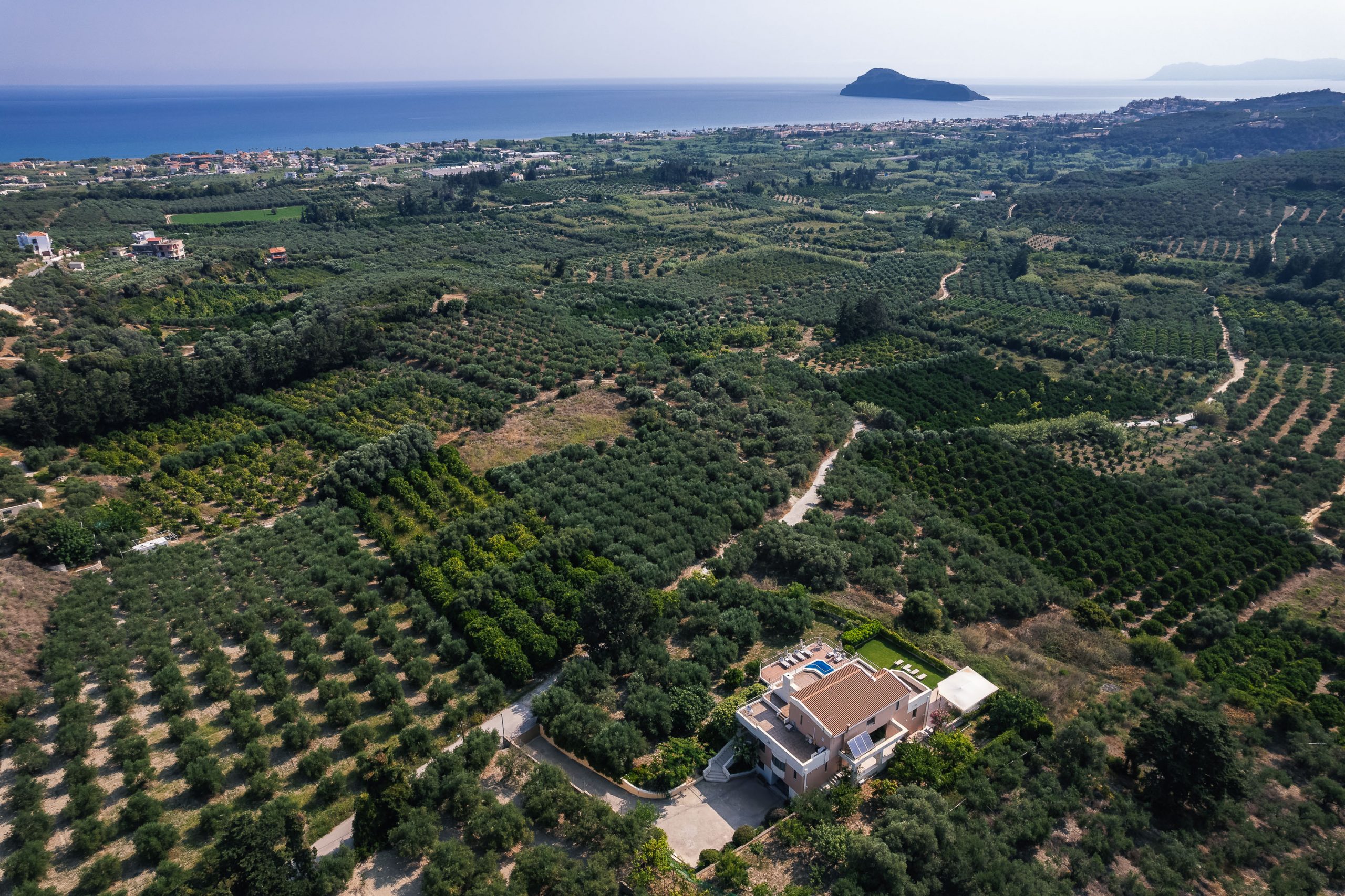 This modern villa in Platanias Chania Crete for sale has been built among the olive trees in an elevated spot with views of the sea that can never be lost. It enjoys the total living space of 520m2 on a plot of land of 2800m2 and consists of 6 bedrooms and 6 bathrooms on 3 levels.