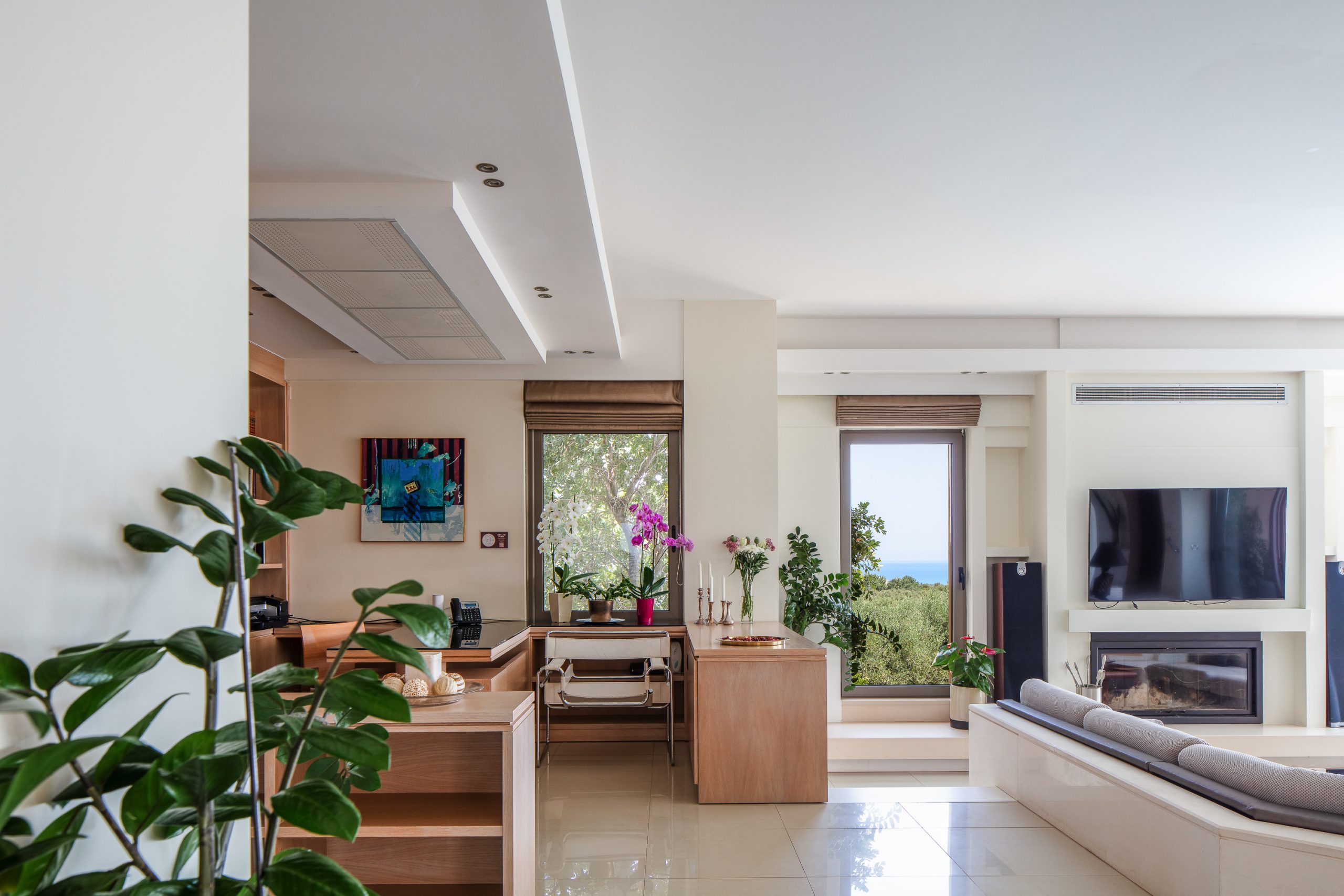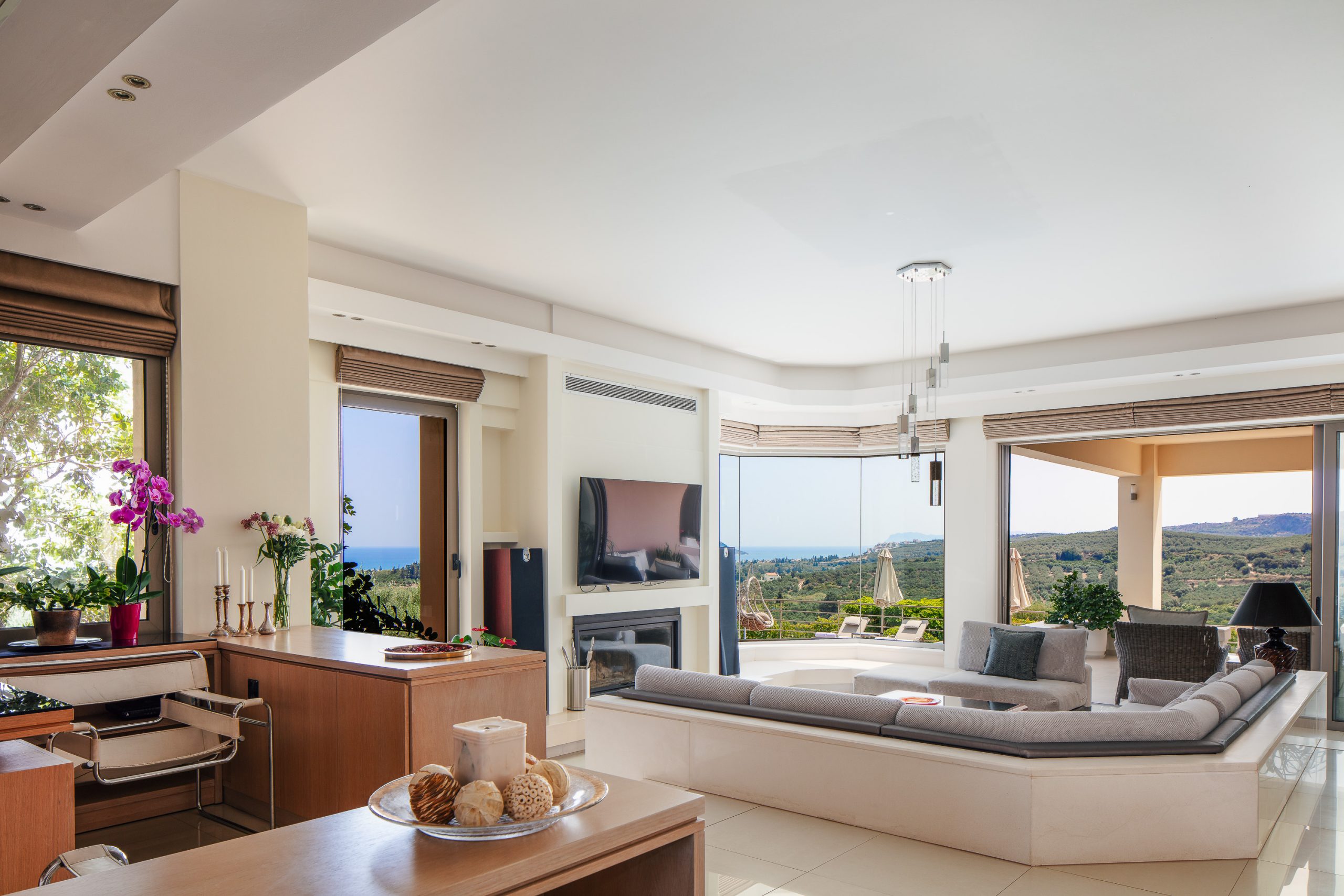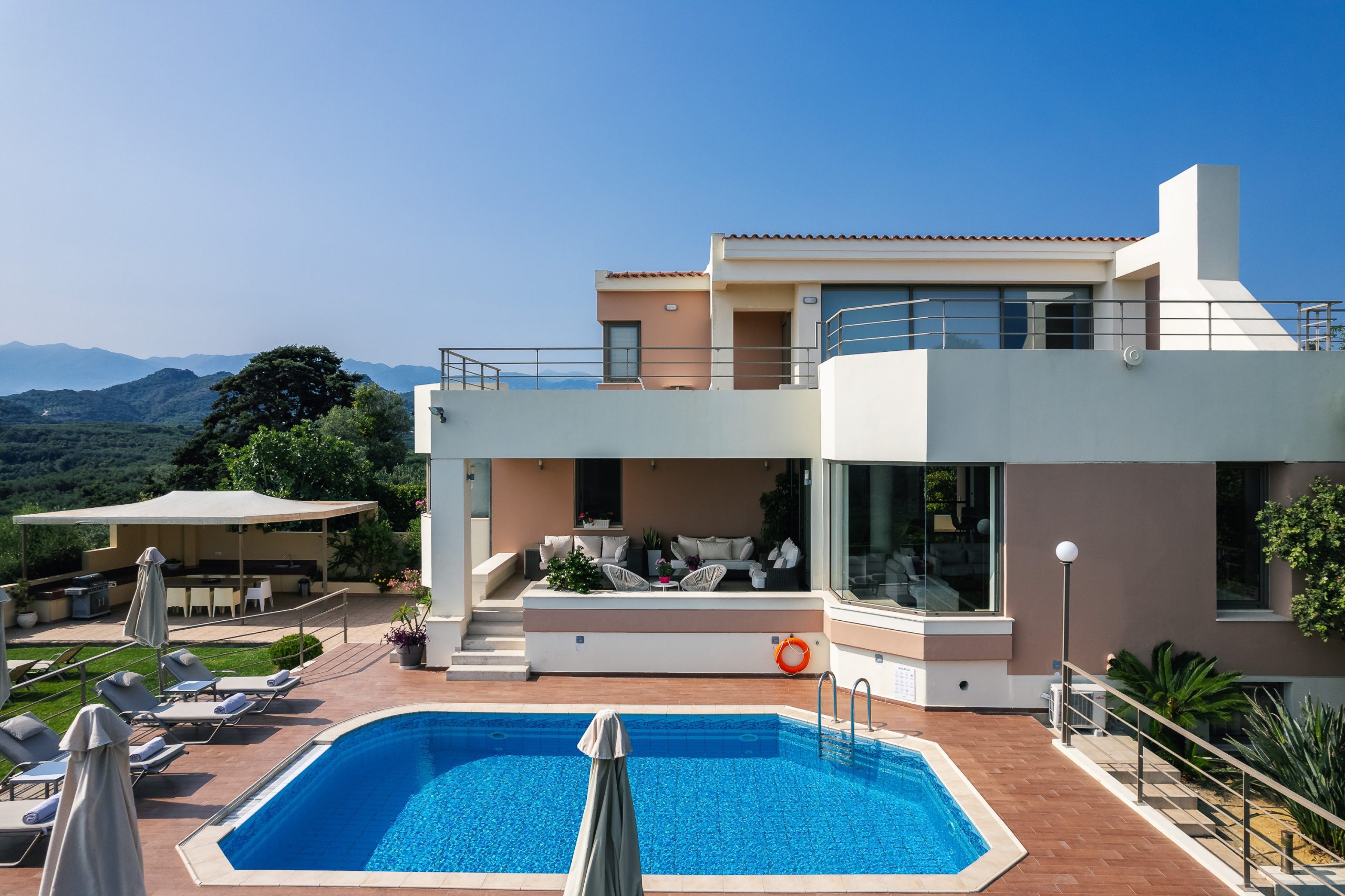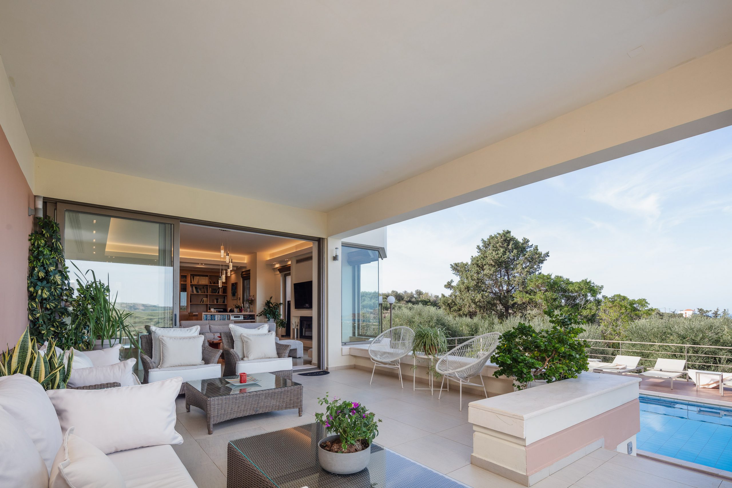 This modern villa in Platanias Chania Crete for sale has been built among the olive trees in an elevated spot with views of the sea that can never be lost. It enjoys the total living space of 520m2 on a plot of land of 2800m2 and consists of 6 bedrooms and 6 bathrooms on 3 levels.