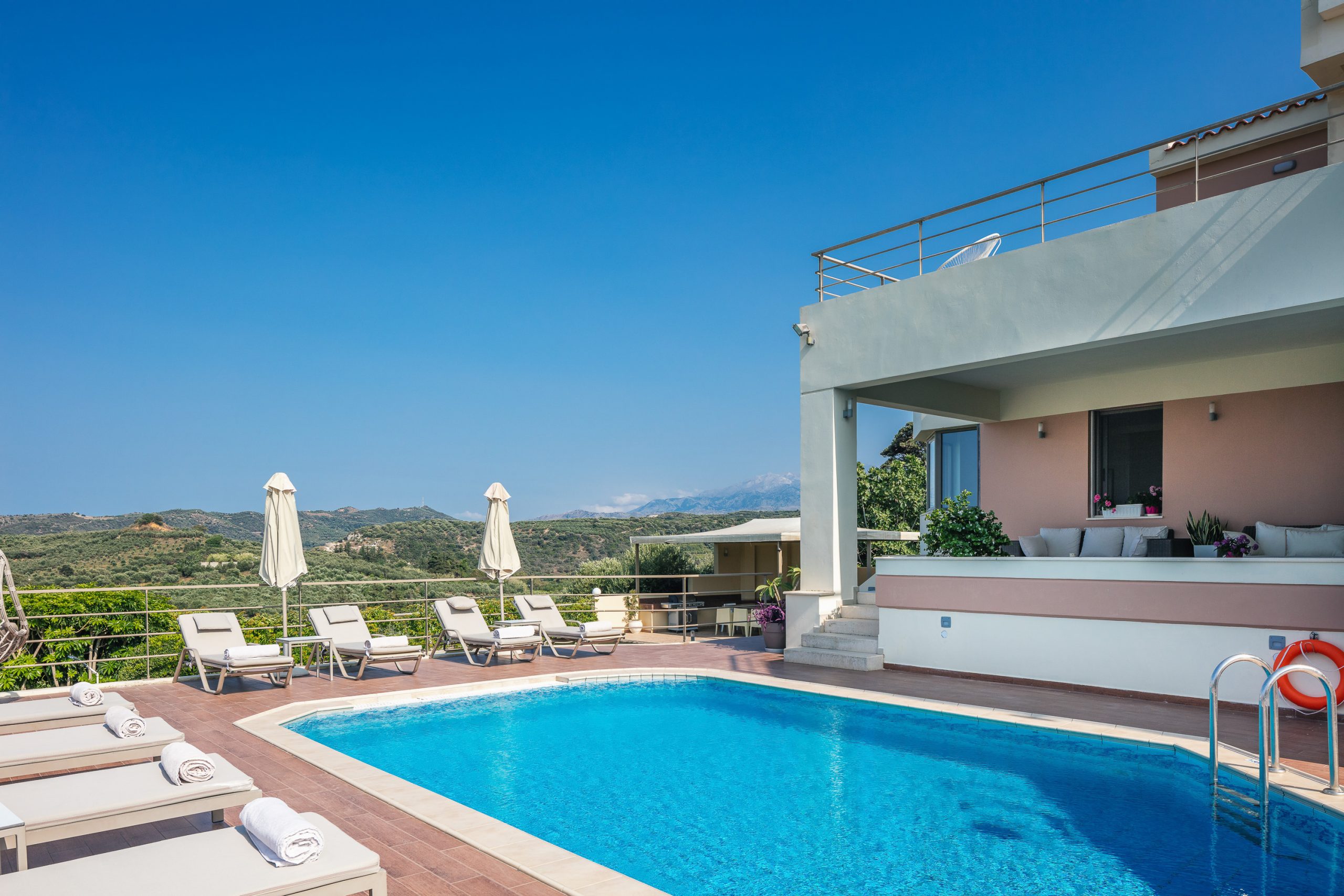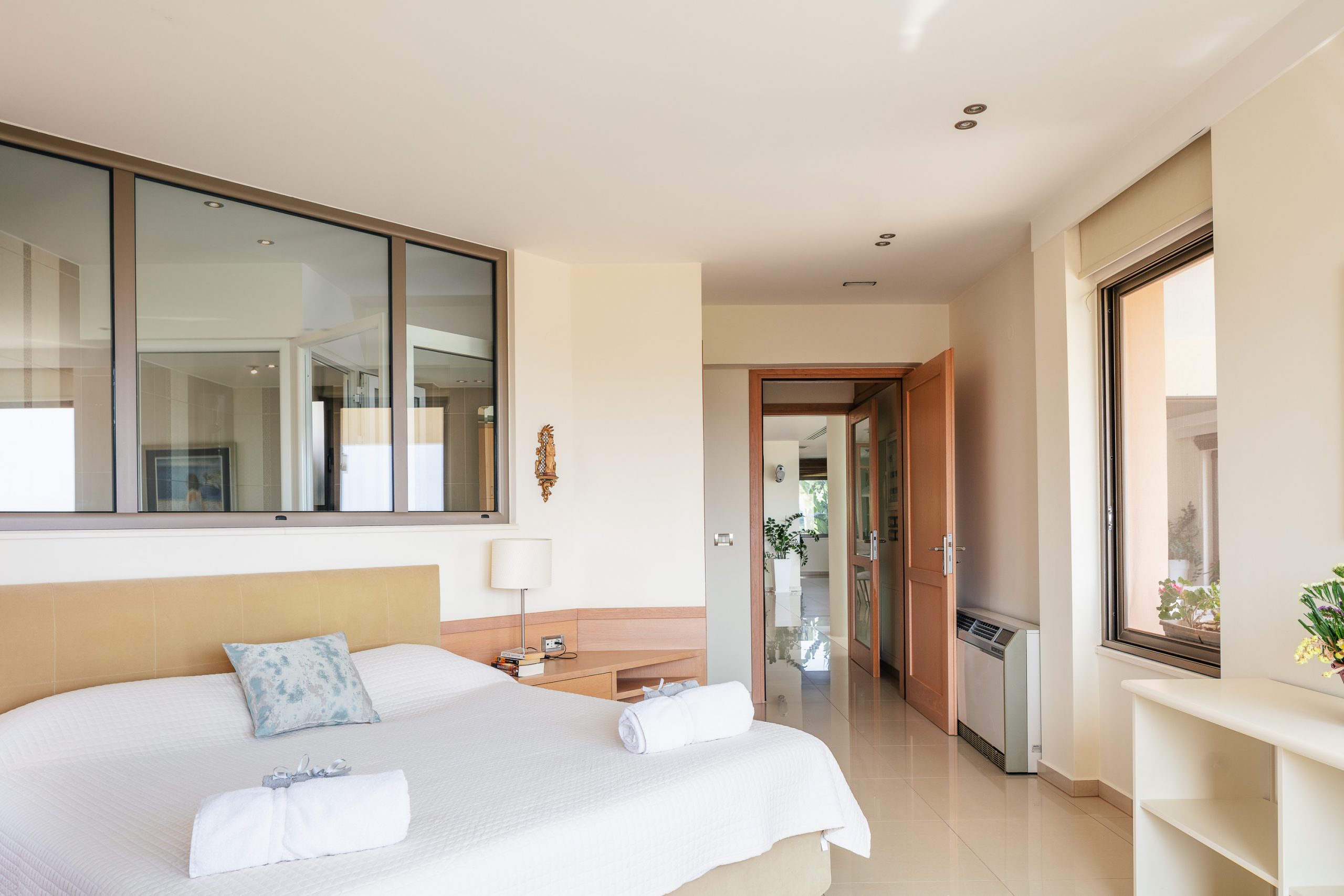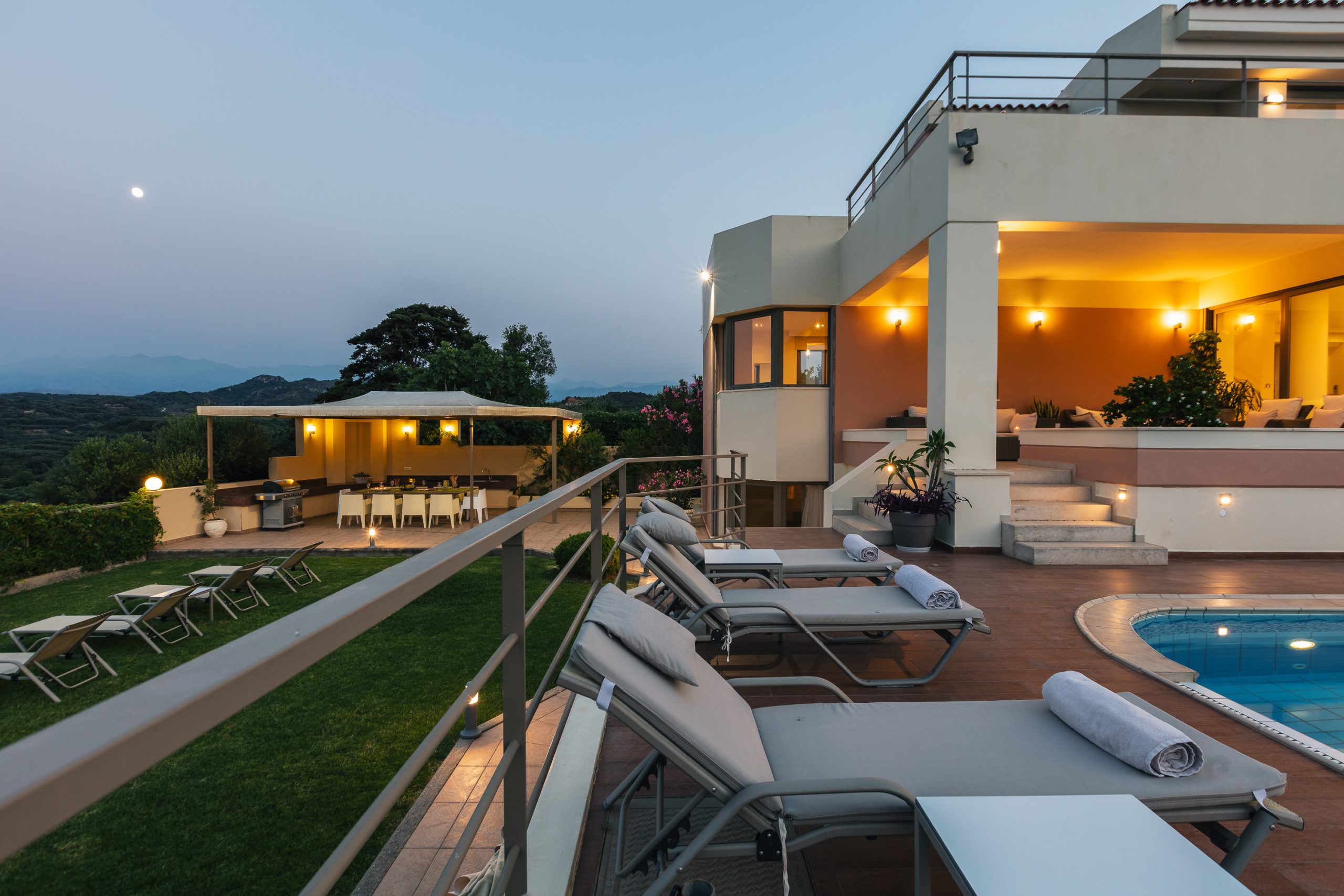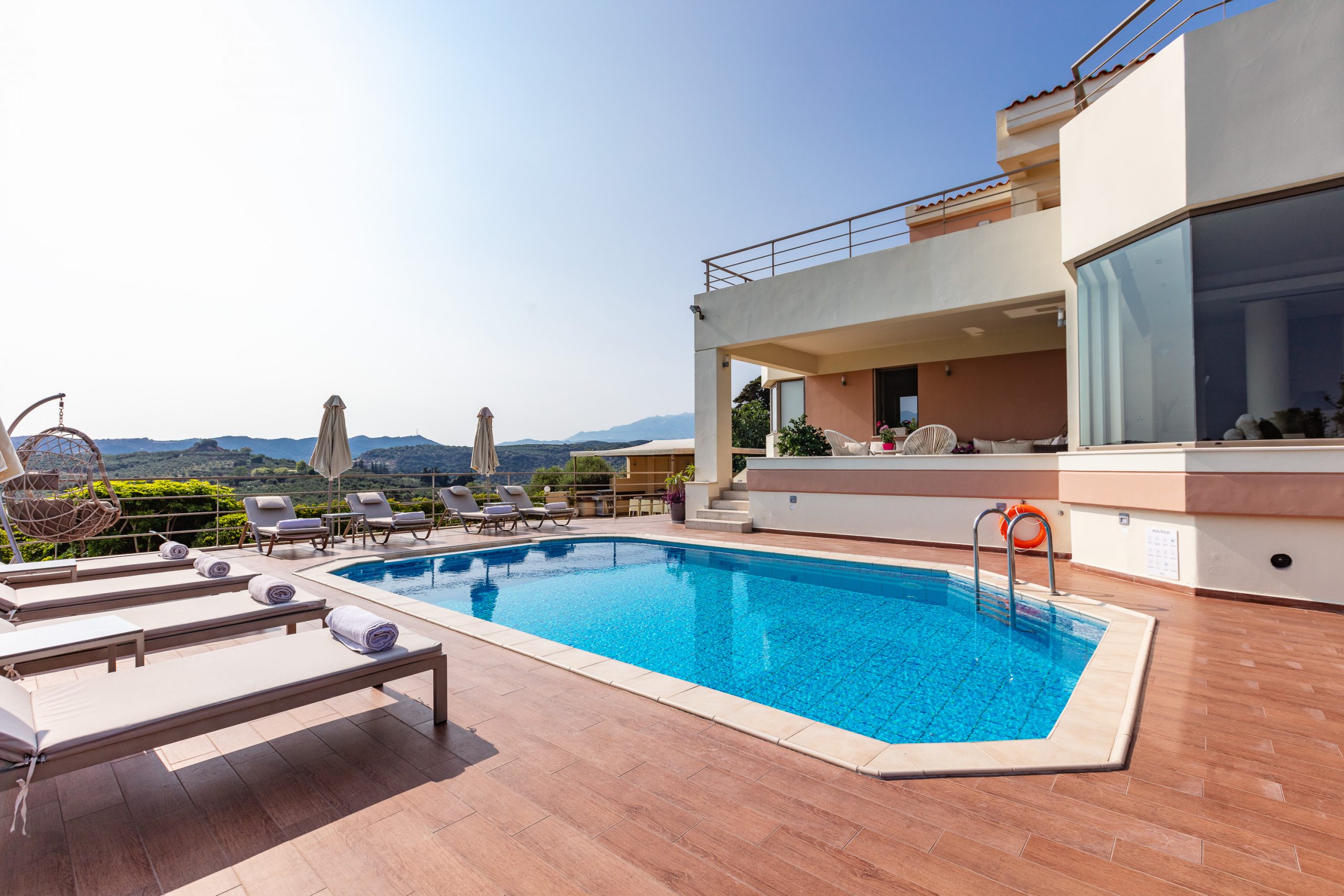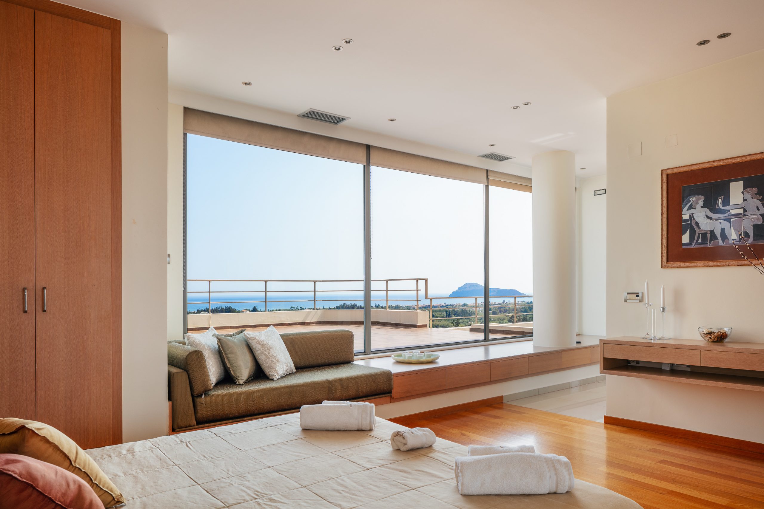 This modern villa in Platanias Chania Crete for sale has been built among the olive trees in an elevated spot with views of the sea that can never be lost. It enjoys the total living space of 520m2 on a plot of land of 2800m2 and consists of 6 bedrooms and 6 bathrooms on 3 levels.