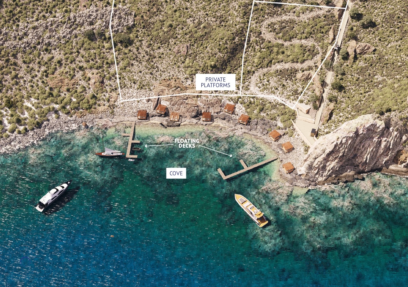 At the edge of the property, the private berth extends into the turquoise waters, where your boat could be docked. The berth is designed to be accessible in two ways: for those who prefer a walk, a charming, winding path leads down from the villa to the water’s edge. Alternatively, for those seeking a more effortless arrival, an elevator transports guests from the villa’s main floor directly down to the berth, offering a quick descent with breathtaking views all around.