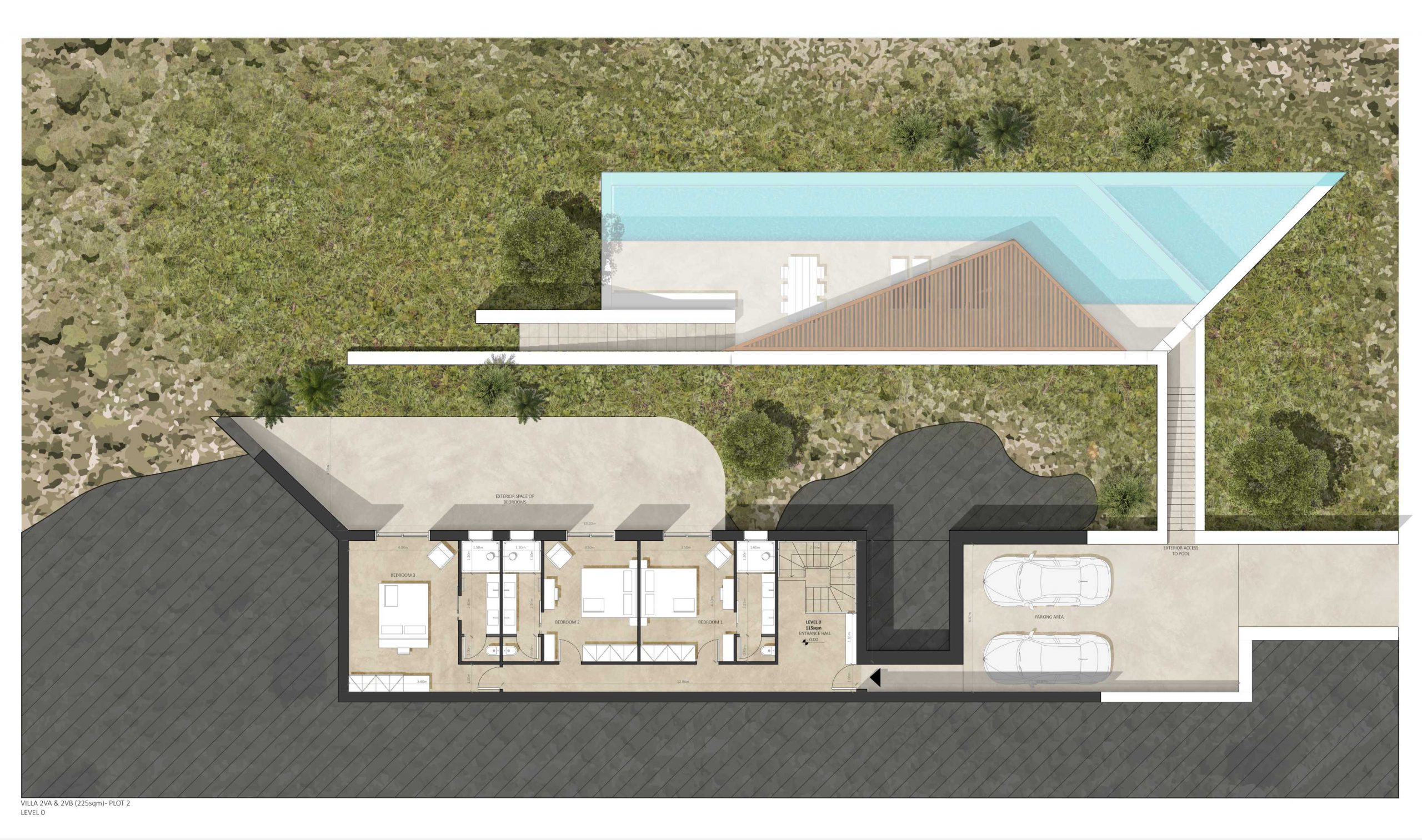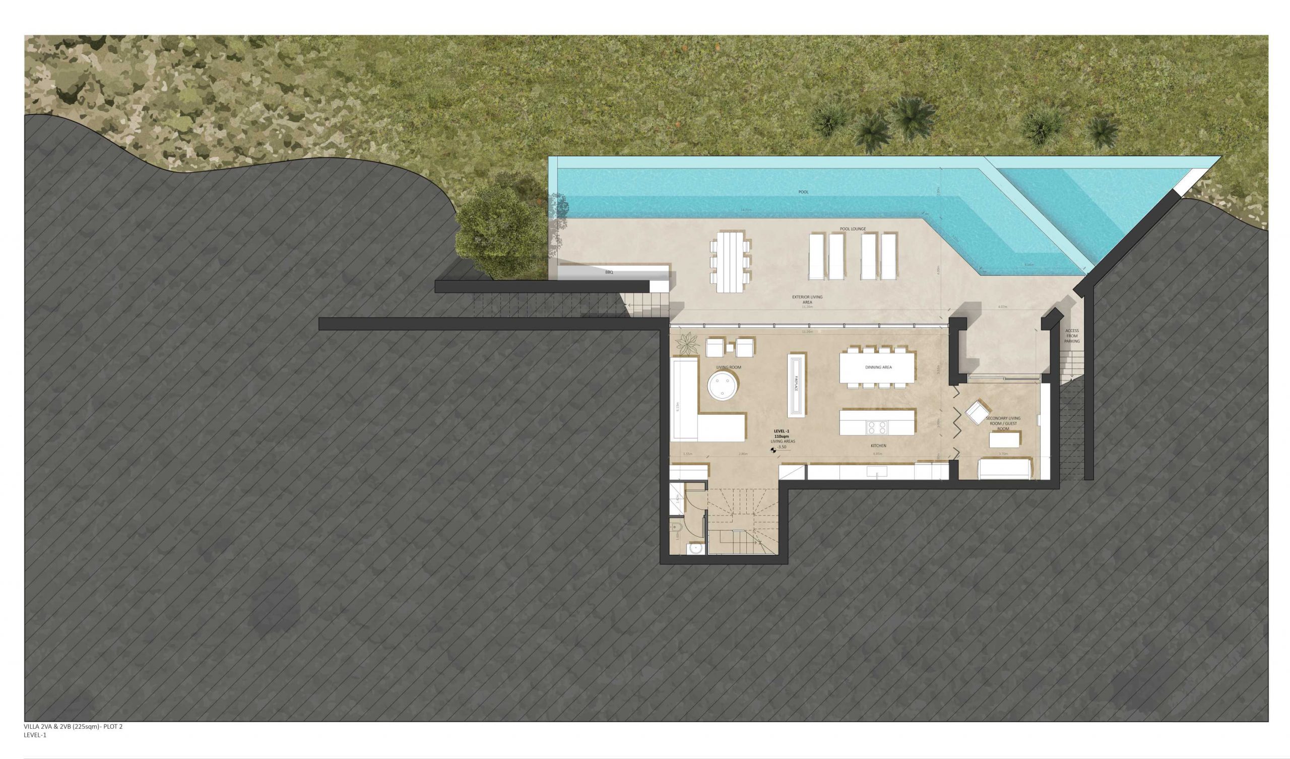 Additionally, this contemporary villa features spacious common areas with a central fireplace, outdoor covered living and dining areas with BBQ facilities, a large private swimming pool and sunbathing area, a landscaped & planted fenced garden with paths all around and a parking area for 2 cars.
