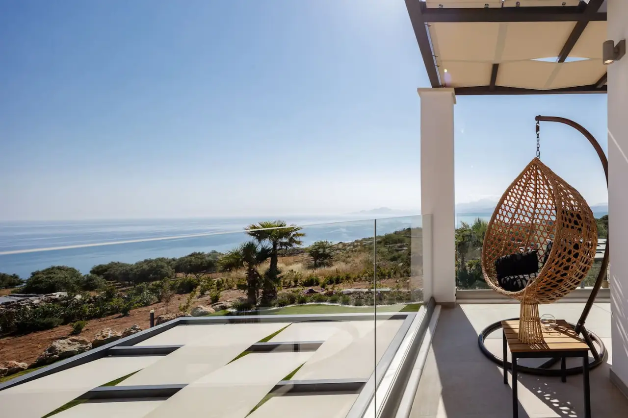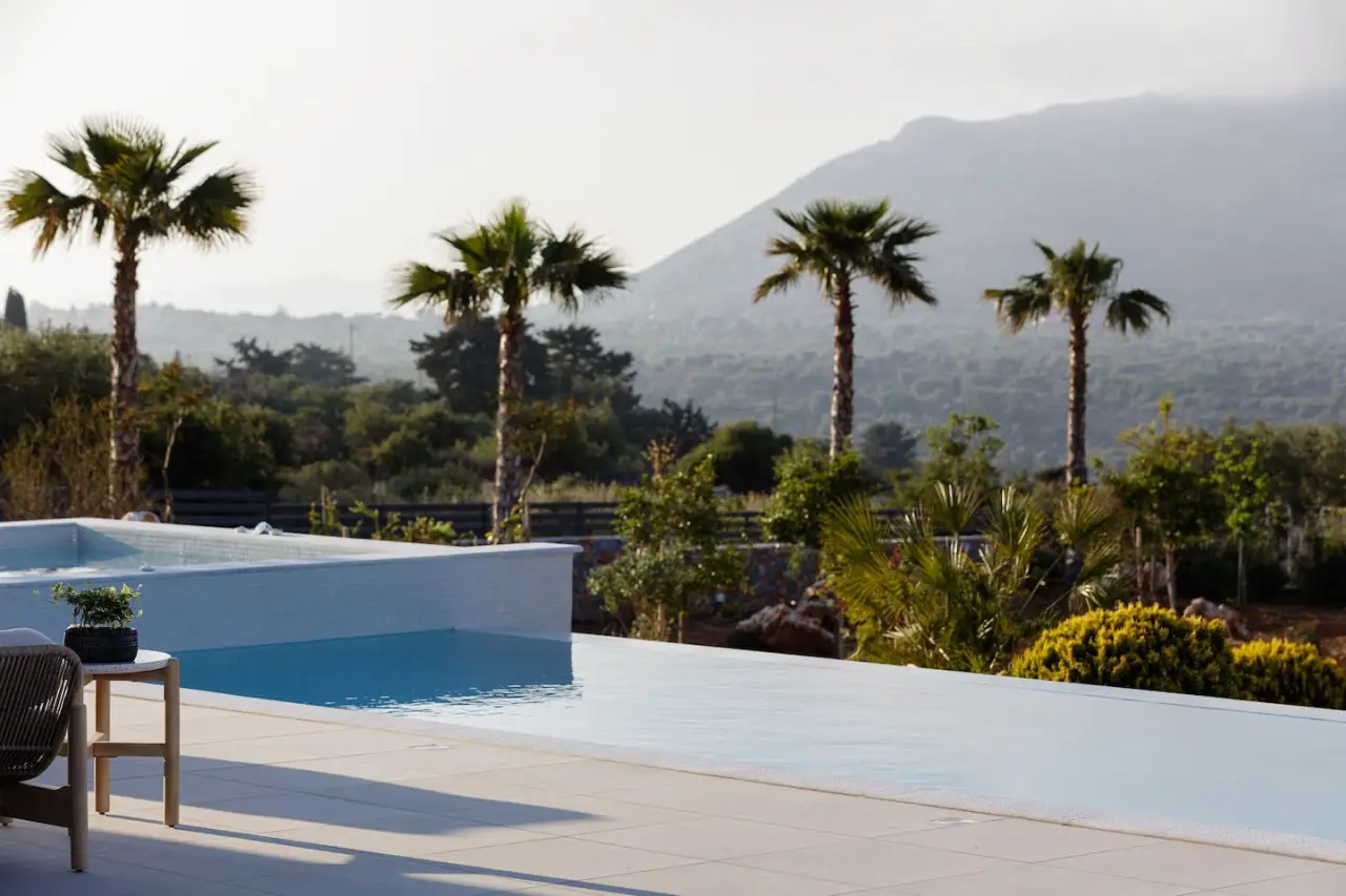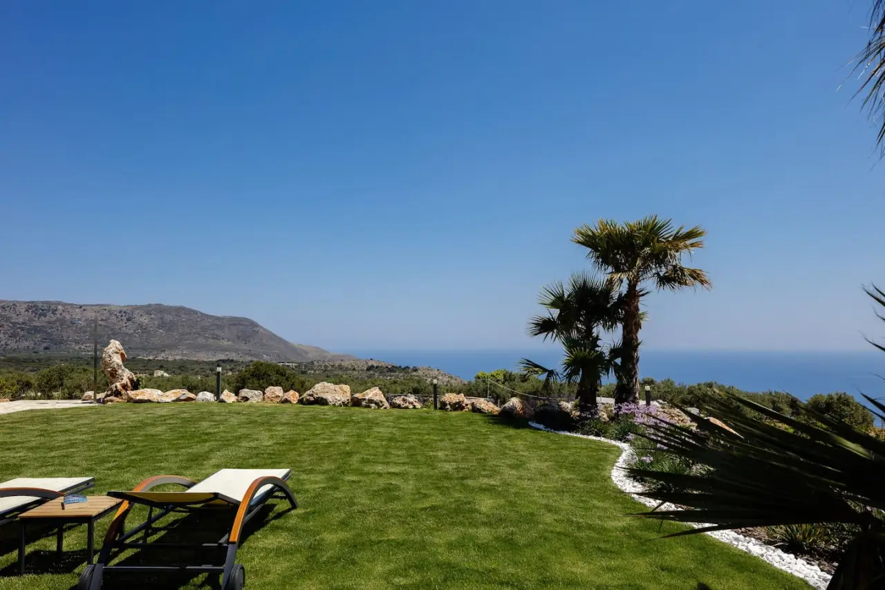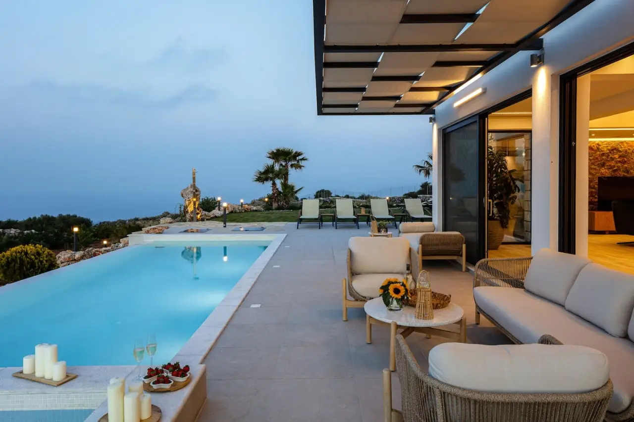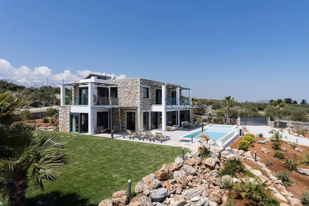This exquisite stone villa in Kefalas Chania Crete for sale represents a rare opportunity to own modern Mediterranean luxury. Developed on a serene hillside in Western Crete, this villa was completed in 2021 and offers 184 square meters of sophisticated living space on a 6,000m2 private estate with unobstructed views of the Aegean Sea, White Mountains, and distant Rethymno coastline.
