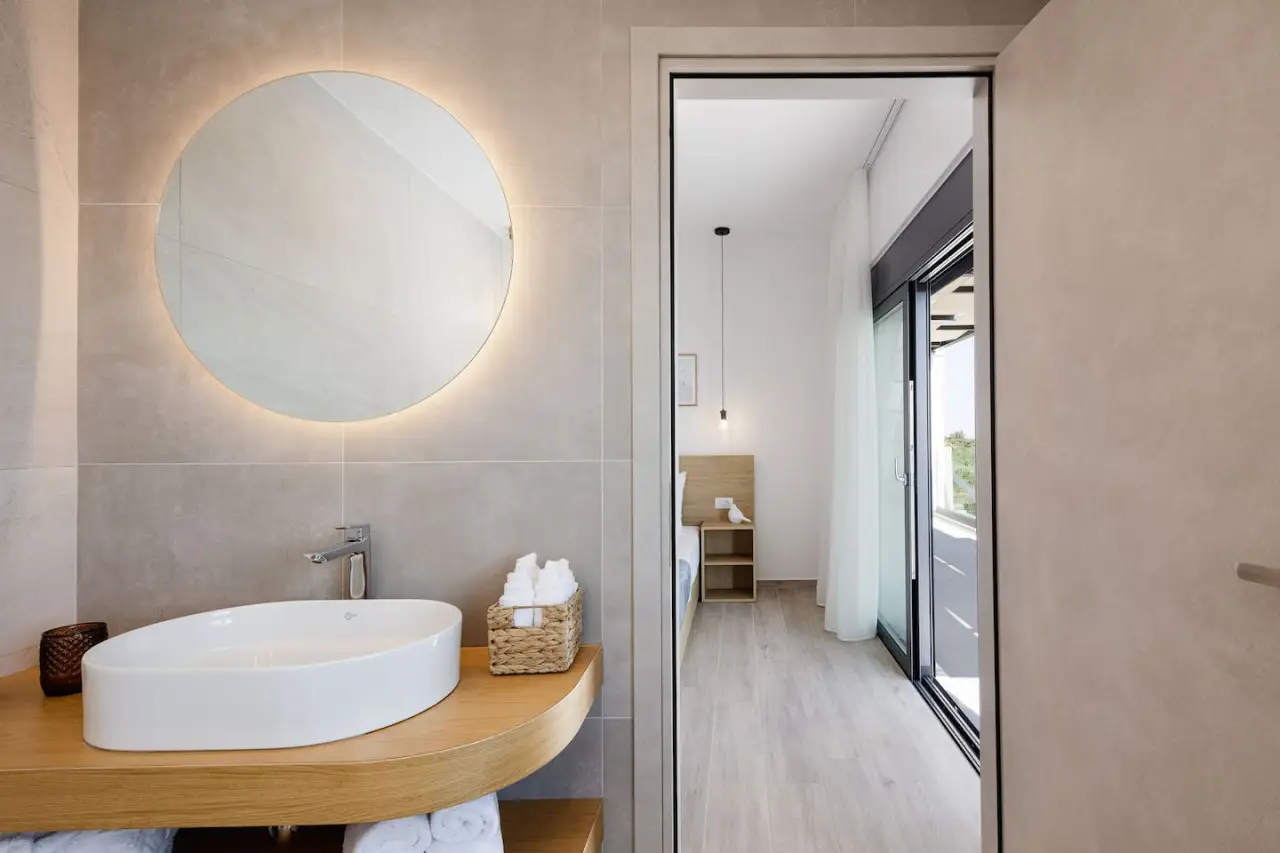 This stone villa in Kefala Chania Crete for sale features four spacious bedrooms and five modern bathrooms, all capturing spectacular 180-degree sea and mountain panoramas. The open-plan living area, dining space, and kitchen flow effortlessly together, flooded with natural light through floor-to-ceiling glass doors. Minimalist design, high-end finishes, and curated décor create refined sophistication throughout, with each bedroom including an en-suite bathroom and designer touches complementing premium materials.